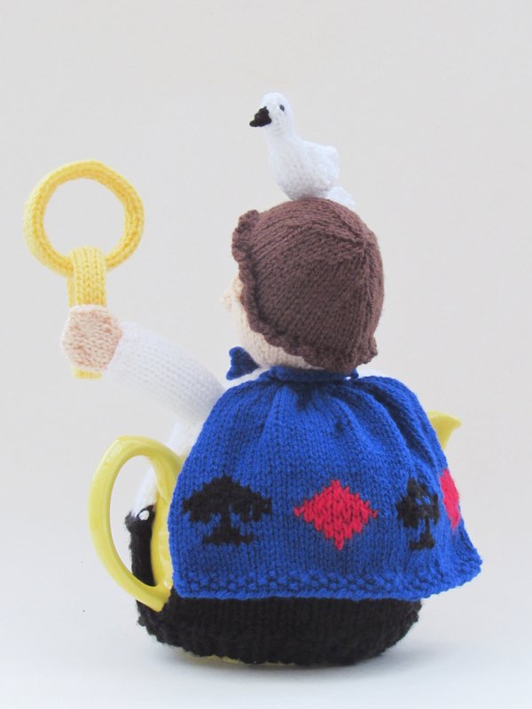 The illusionist is dressed magnificently in a royal blue cape that has card suits across the back and his cape matches his dickie bow. The cape of the tea cosy is knitted in intarsia, or the design could be Swiss darned on at the end.