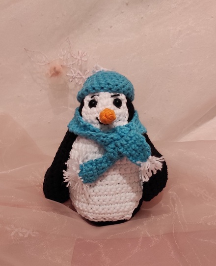 This little penguin with those cute eyes has adapted well to the cold temperatures. However, having lived in Central Europe all his life, he prefers wearing a scarf and a hat. On the other hand, he won't ever complain about the summer heat if you take of his clothes then.