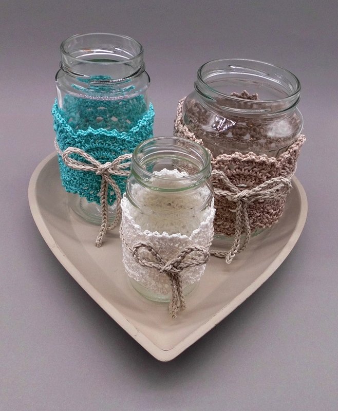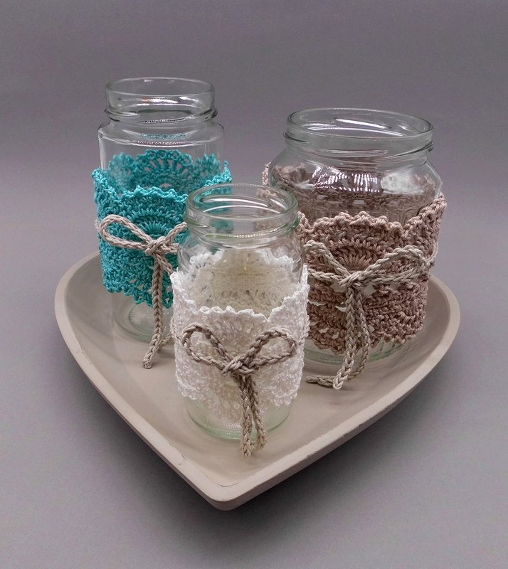 The border in the Shabby Chic look can be transformed again and again versatile and can be crocheted for any straight glass in any size (for example, lanterns, jam, vegetable or sausage jars) and fits not only to the country style, but also to modern furnishings.