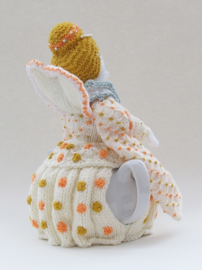 The main part of the dress in knitted in the vintage style tea cosy pattern to give a really billowy look to the skirts of her dress. At the top she has a flounce. From the flounce upwards the knitting has a diamond pattern and where the diamonds cross is a spot.