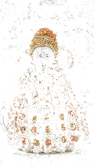 Her arms have hanging sleeves that hang down as far as her skirts, and her bodice has a ruff and a standing collar.