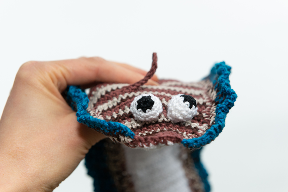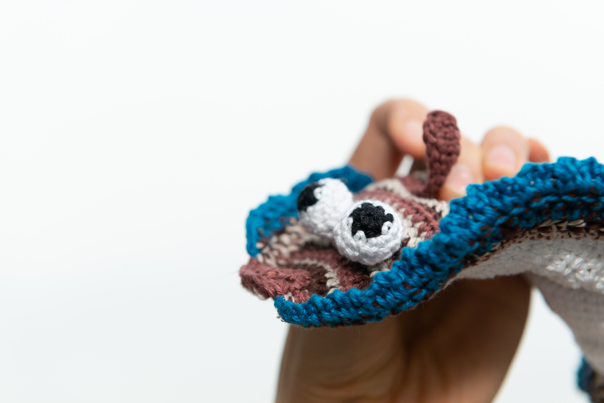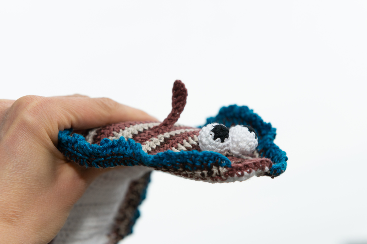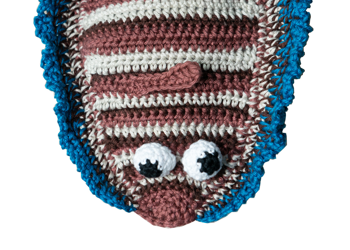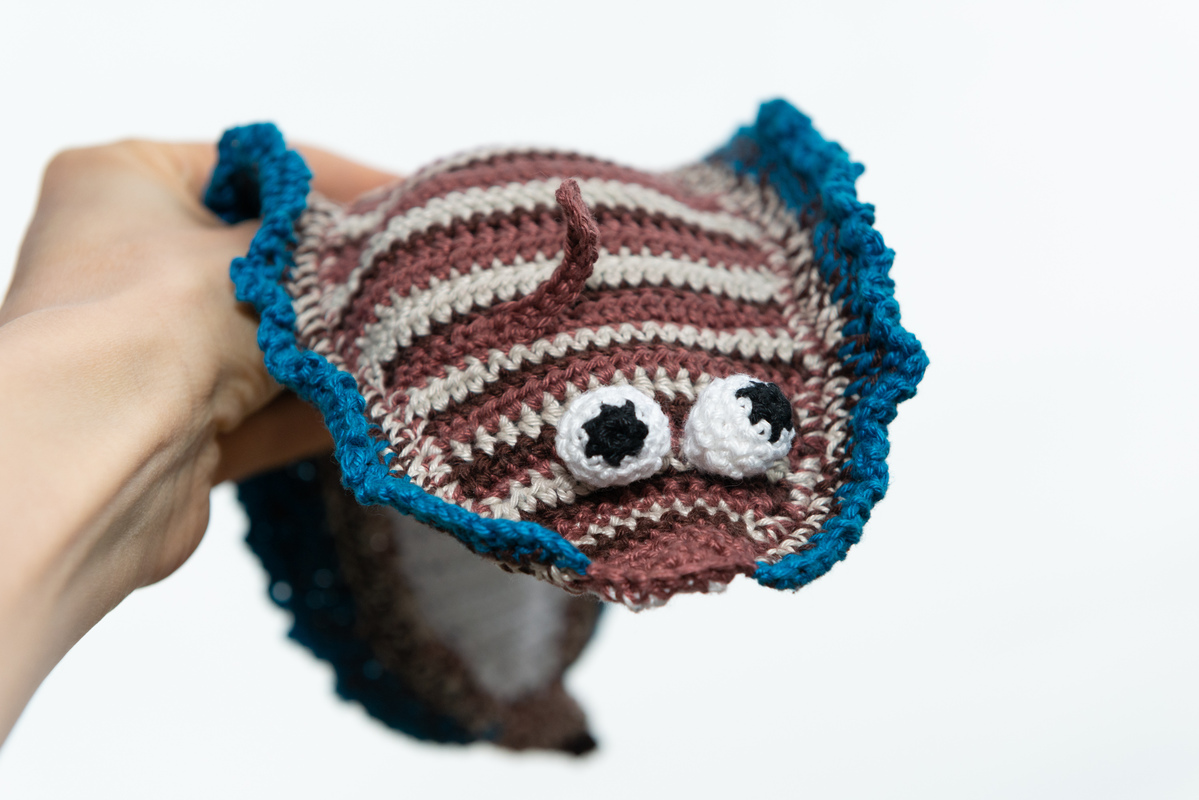 First crochet the eye side of Zyndi the Banded Sole. Then the two eyes are crocheted and sewn to the eye side. Then the blind side is crocheted. Then the blind side and eye side are crocheted together. Then the dorsal fin, tail fin and pectoral fin are crocheted counterclockwise around the fish. Finally, the small pectoral fin is crocheted and sewn to the sole.