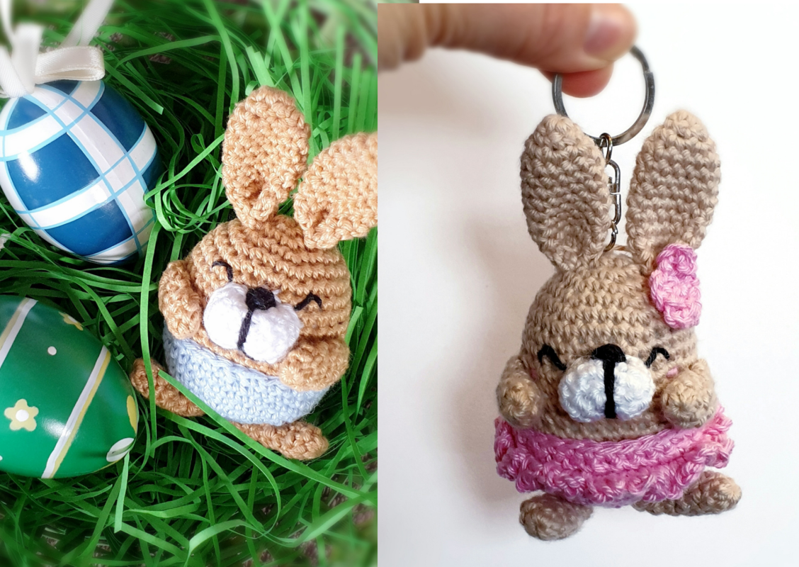 Crochet little bunnies for Easter or as a key ring. Also a cute cuddle friend crocheted with velvet wool. You can also crochet them for a mobile and bring them to the baby shower as a gift.