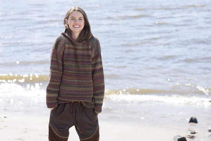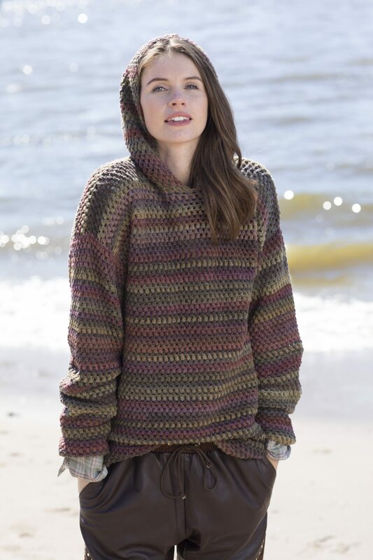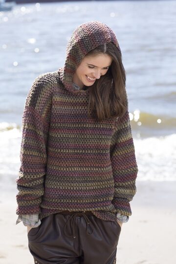 Ganz lässig und bequem im Schnitt, ausgesprochen weich durch Merino-Alpakawolle, außerdem mustergültig durch plastische Büschelmaschen – in diesem langen Kapuzenpulli fühlt man sich garantiert wohl!
