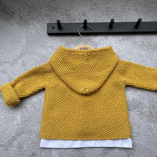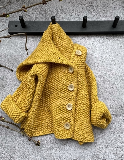 Diese Baumwolljacke wird von vorne nach hinten gestrickt. Die Ärmel werden sofort mit angestrickt damit du so wenig wie nötig Nähte zusammennähen musst. Zuletzt werden die Maschen am Halsausschnitt aufgenommen um die Kapuze zu stricken.