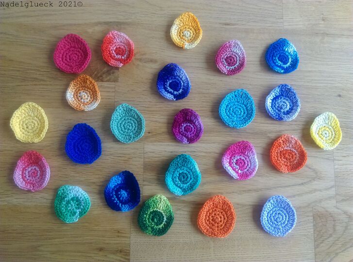 Wenn du die Eier aus Stickgarn häkelst, sind sie etwa 3,5-4,5 x 3-4 cm groß.