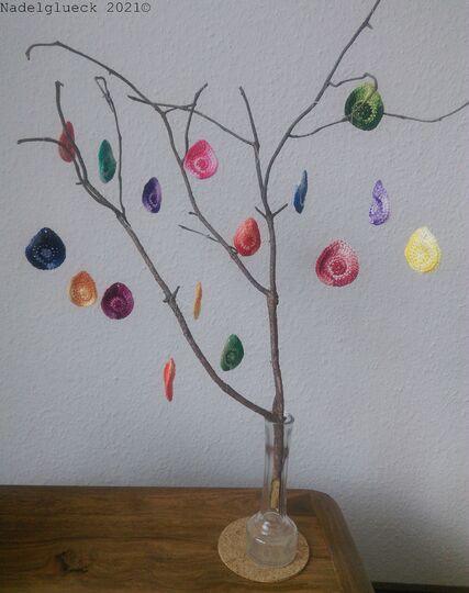 In der vierseitigen Anleitung mit sechs Fotos beschreibe ich, wie man den Osterschmuck häkelt. Dazu solltest du folgende Maschen beherrschen: Luftmaschen, Kettmaschen, feste Maschen, halbe Stäbchen, (ganze) Stäbchen und Doppelstäbchen.