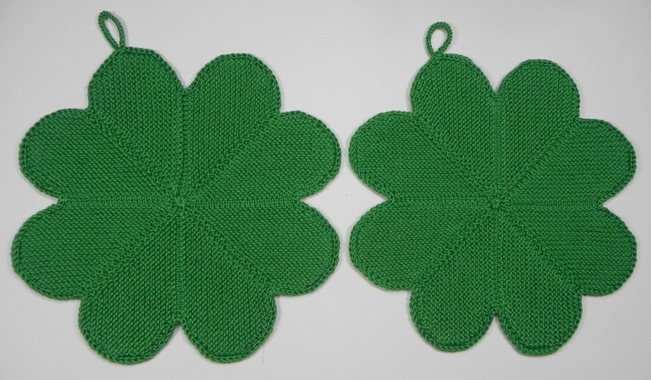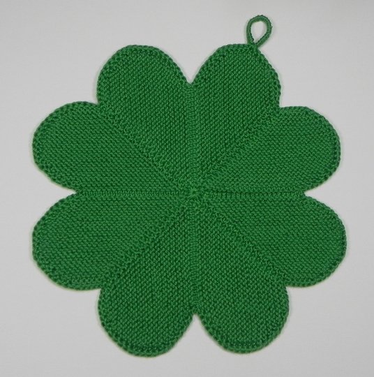Dies ist eine PDF-Anleitung zur Herstellung eines gestrickten Topflappens in 4-blättriger Kleeblatt-Form.