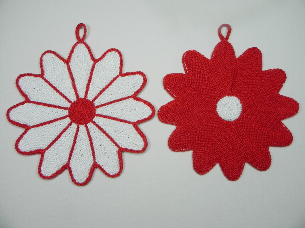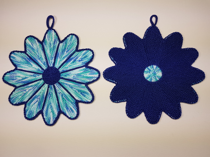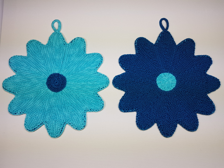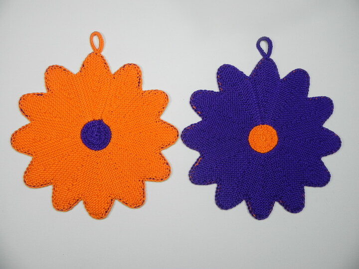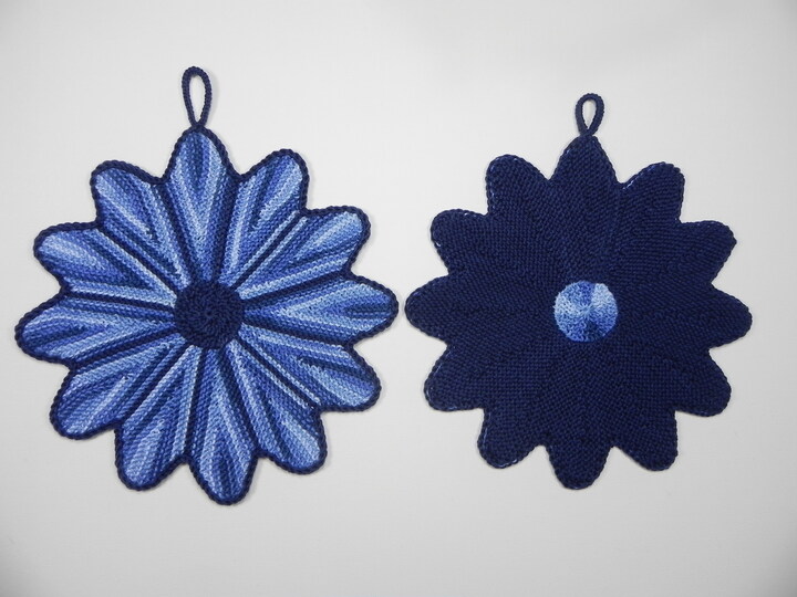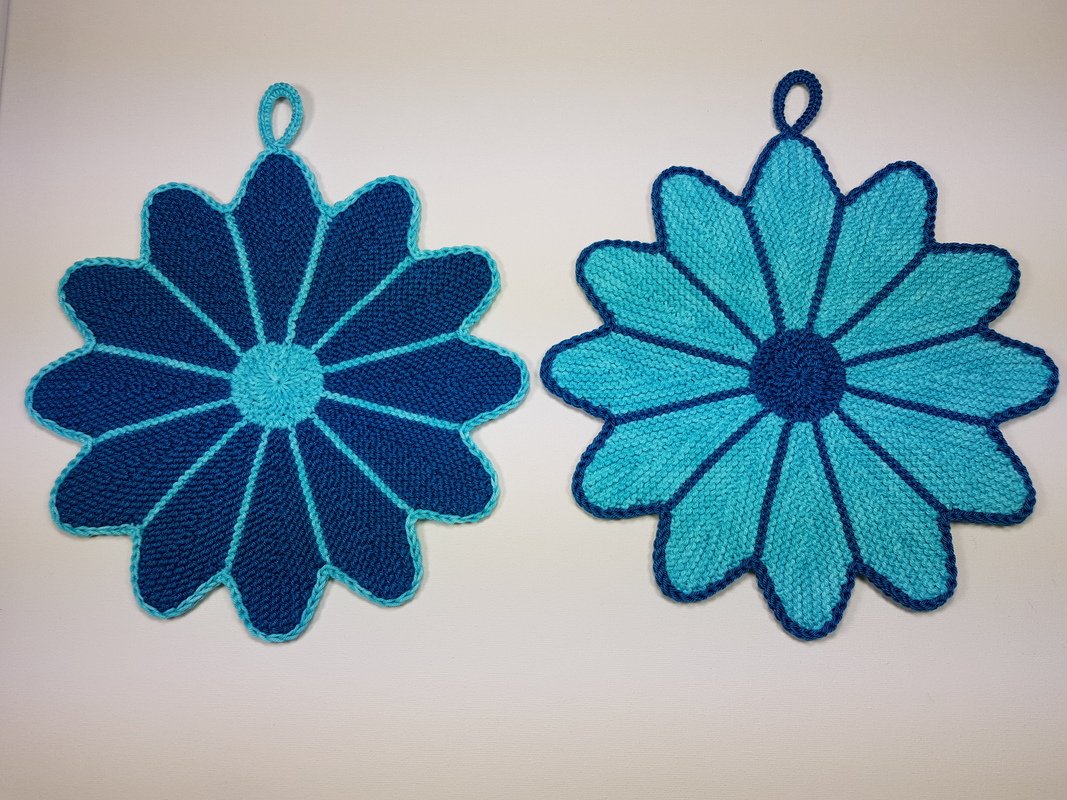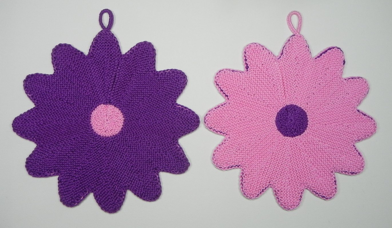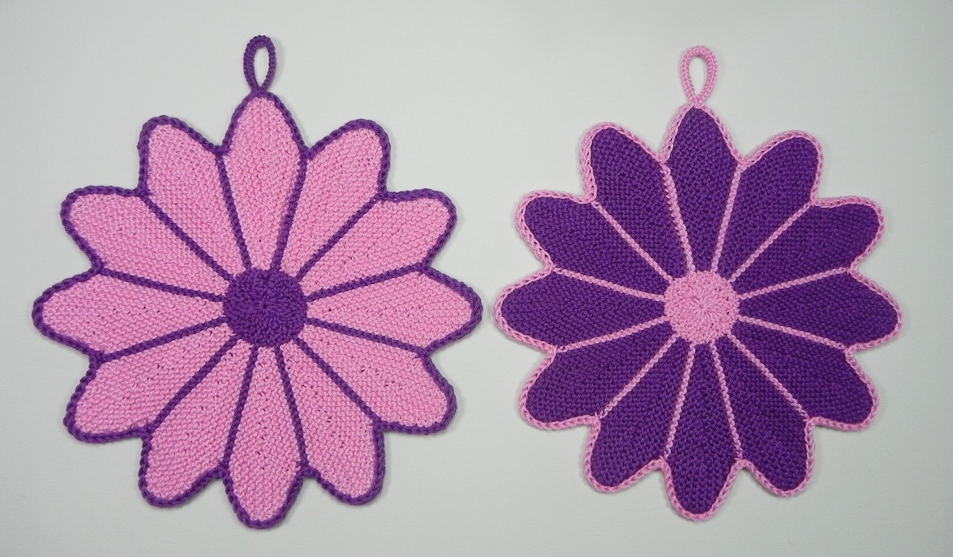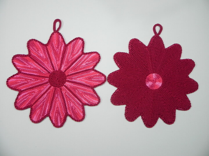Dies ist eine Anleitung zur Herstellung eines gestrickten Topflappens in einer Blumen-Form.