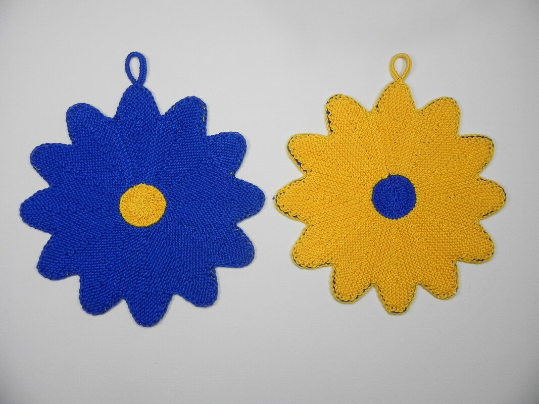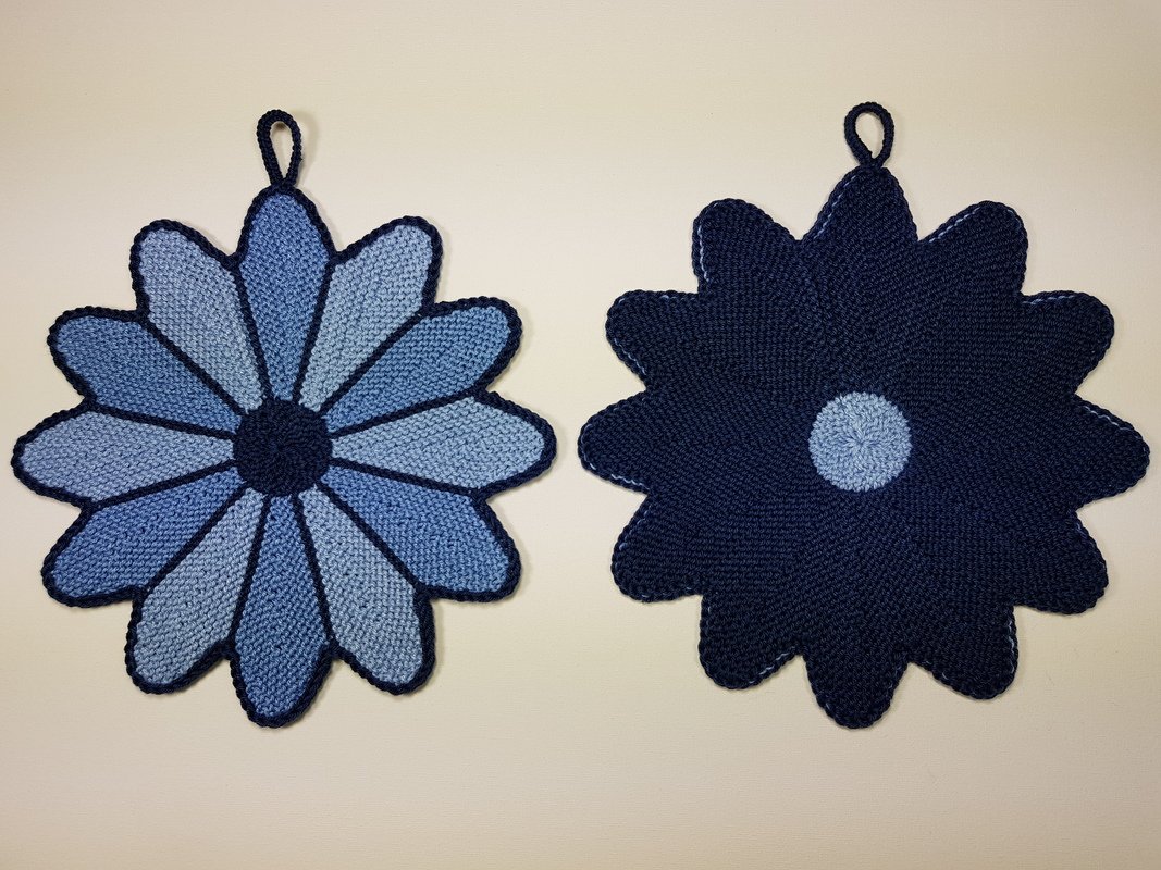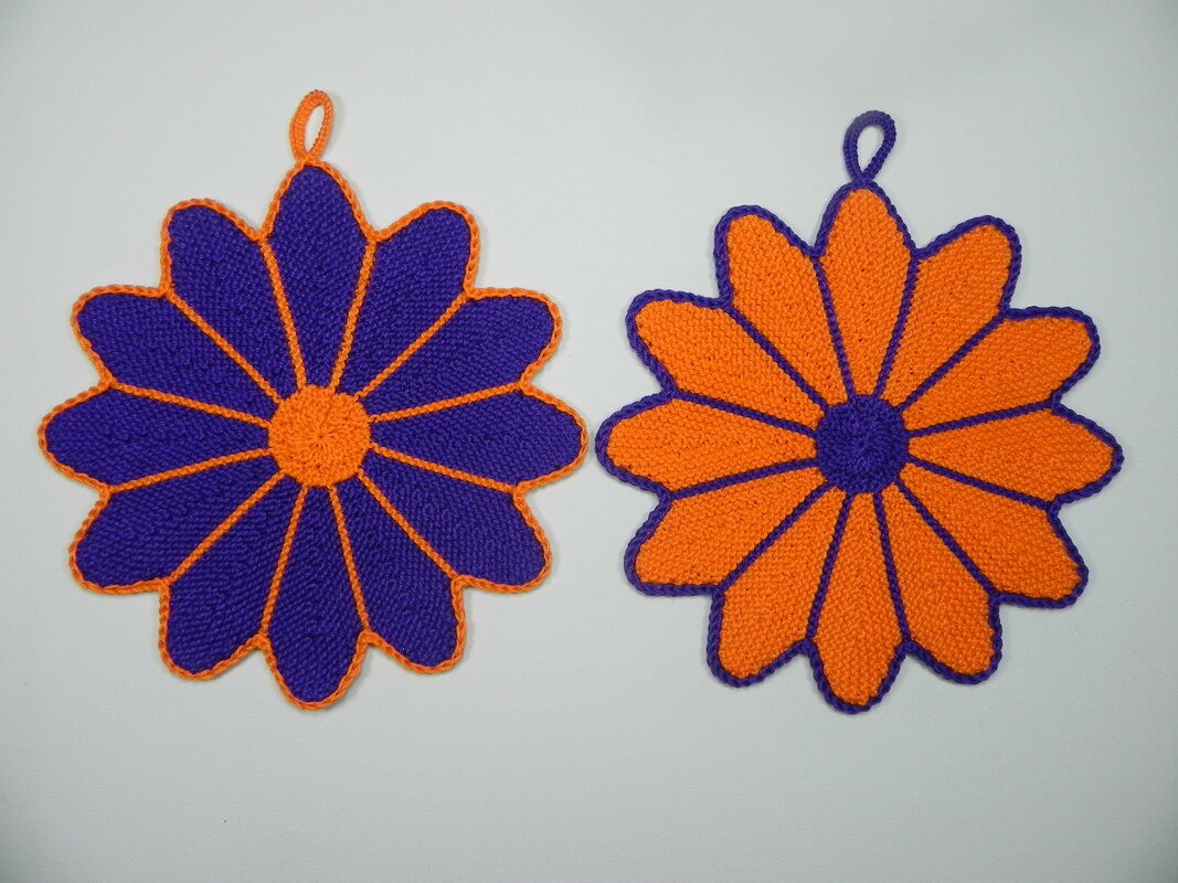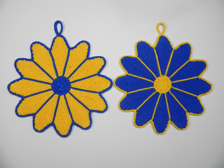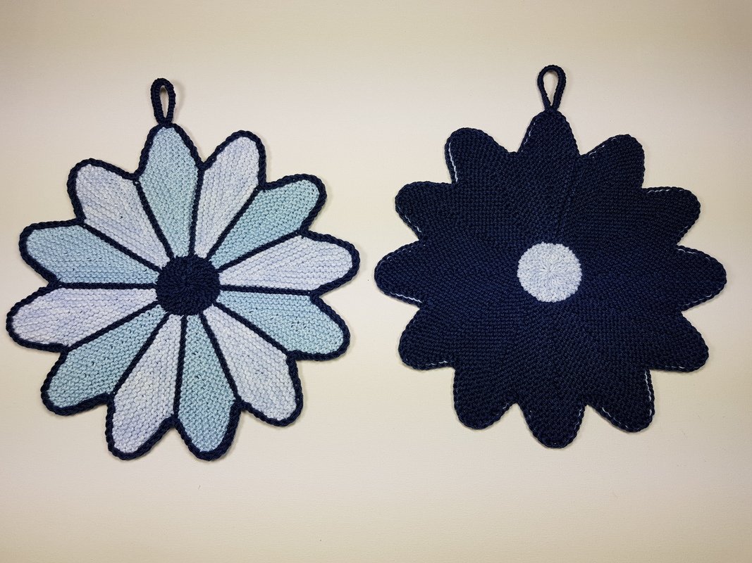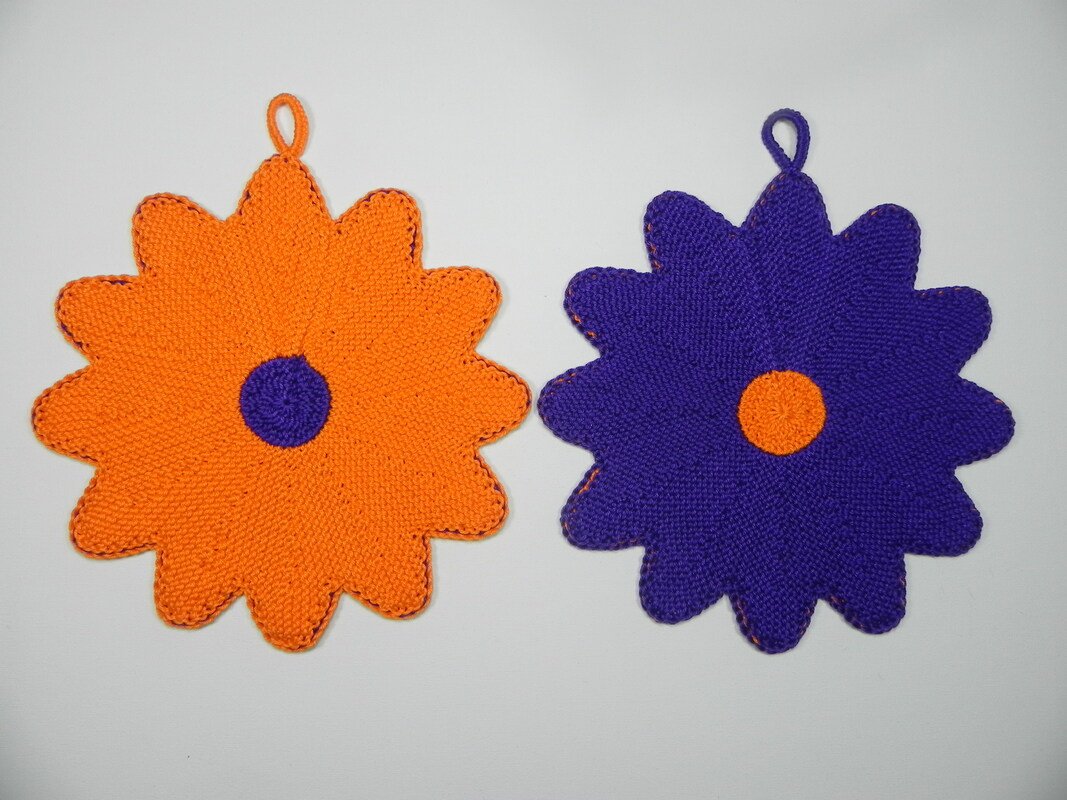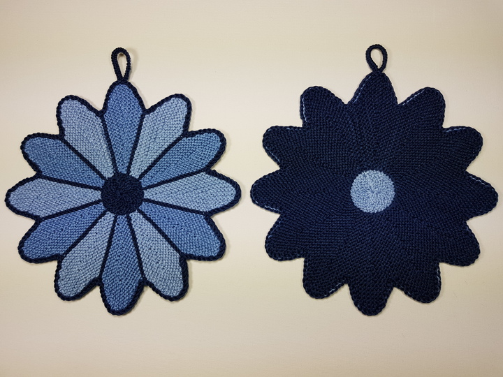Dies ist eine Anleitung zur Herstellung eines gestrickten Topflappens in einer Blumen-Form.