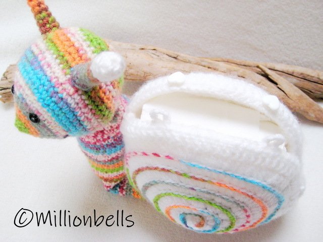 This PDF pattern will guide you to crochet a snail tissue holder as shown in pictures, made using soft acrylic yarn (DK / 8 ply) and crochethook E (3.5 mm).