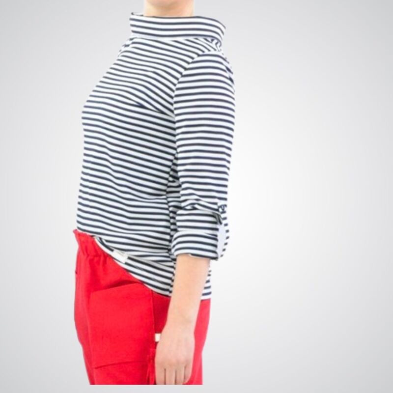 With the Lisette pattern, you can sew a sporty shirt with an elegant stand-up collar. The sleeves can be rolled up and fastened with a ribbon. The waistband is asymmetrical and longer at the back, which gives the shirt a particularly casual touch.
