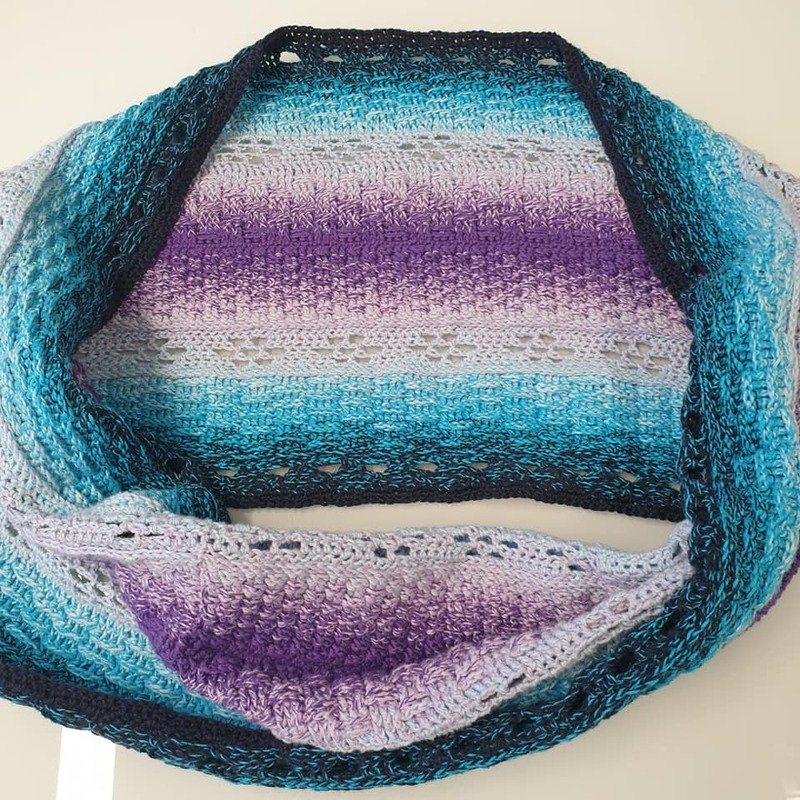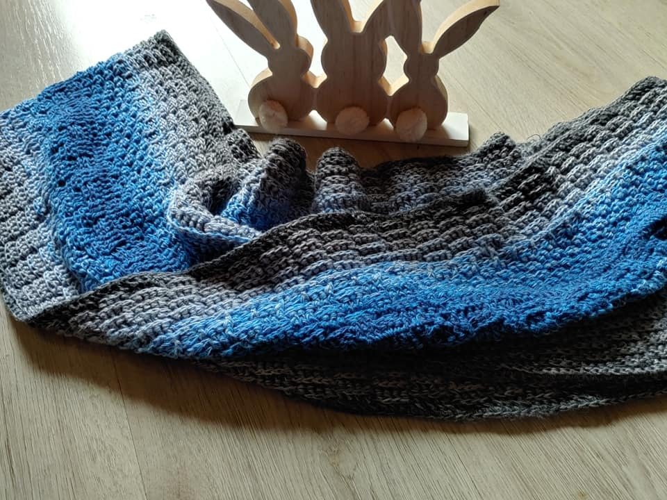 Die Version für Damen wurde aus einem Farbverlaufsbobbel mit 1200 mLL, 4 fädig und NS 3,5 gehäkelt und hat eine Breite von 30 cm und ist in der Runde 1,50. Du kannst auch hier eine längere Lauflänge verarbeiten und den Möbius beliebig groß gestalten.