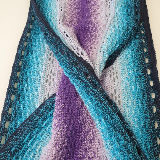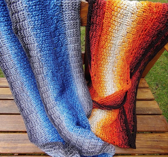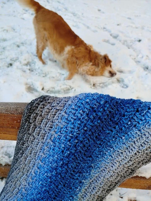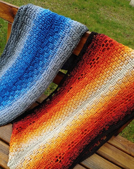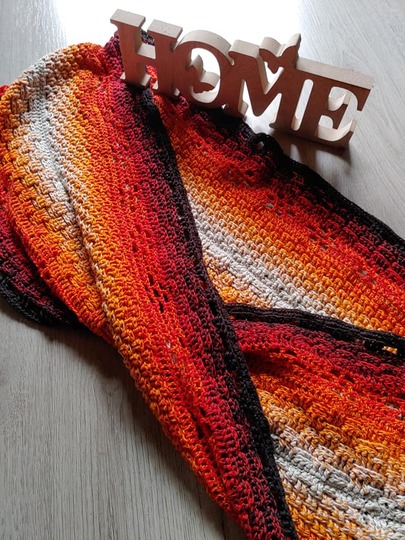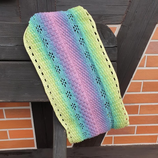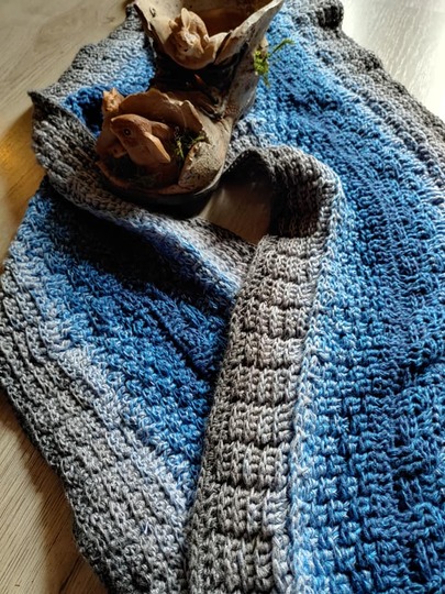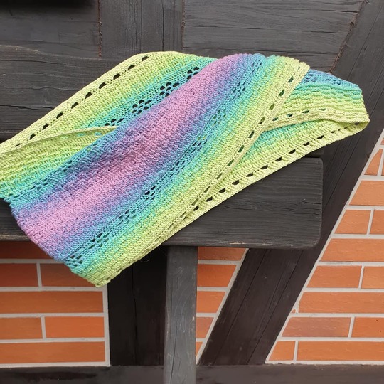 Die Version für Herren wurde aus einem Farbverlaufsbobbel mit 1200 mLL, 4 fädig und NS 3,5 gehäkelt und hat eine Breite von 23 cm und ist in der Runde 1,50. Das sind aber nur Beispiele. Du kannst auch eine längere Lauflänge verarbeiten und den Möbius beliebig groß gestalten.