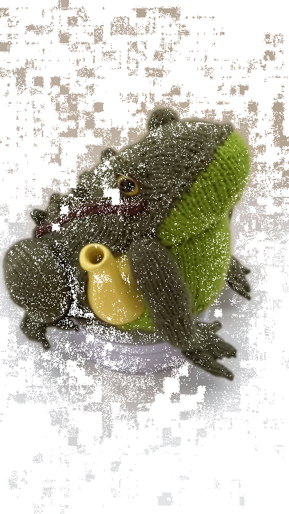 I designed the frog to be in a sitting position, so his head is elevated and he's pushing up on his forelegs. His green webbed feet are super cute and they rest on the table as if he's ready to hop off in an emergency.