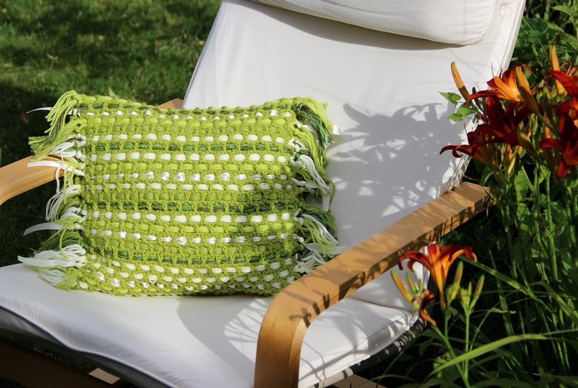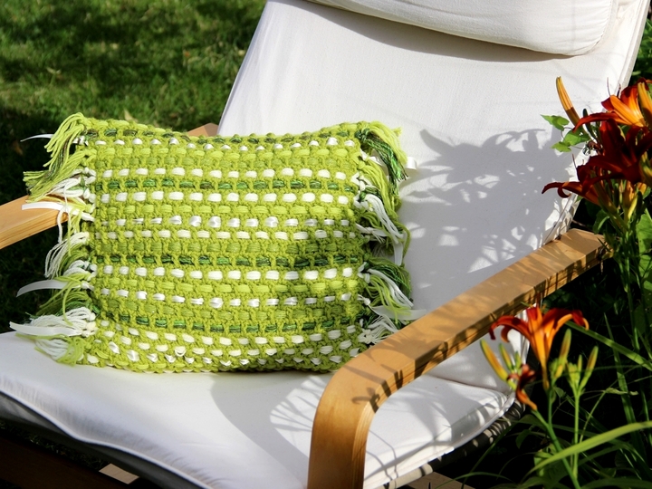 Wir häkeln erst ein Gitternetz aus Luftmaschen, festen Maschen und Stäbchen. Dafür brauchen wir 200 g "Bravo"-Wolle und eine Häkelnadel der Stärke 5. Durch das Gitternetz ziehen wir dann verschiedene Wollreste, Bänder, Stoffstreifen, Schleifen etc. So bekommt jedes Kissen seinen eigenen individuellen Look.