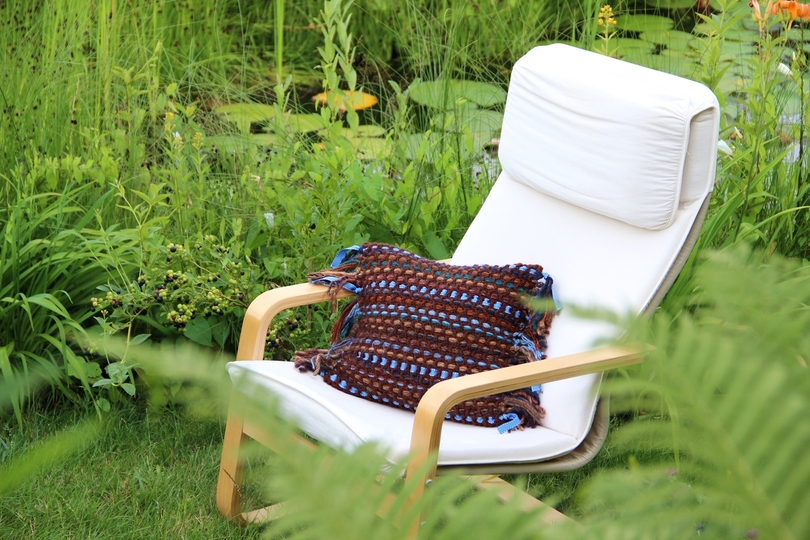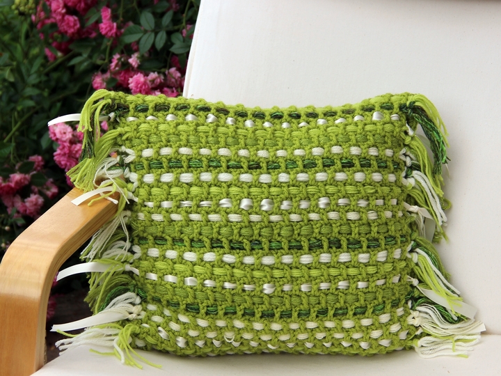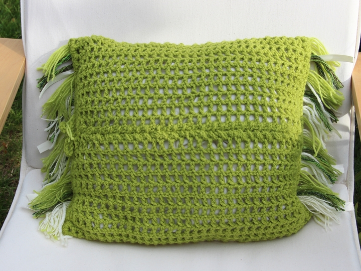 Wer Lust auf ein einfach zu häkelndes Kissen und auf die Verwendung diverser Wollreste und Bänder ist, wird sich über dieses Projekt freuen.