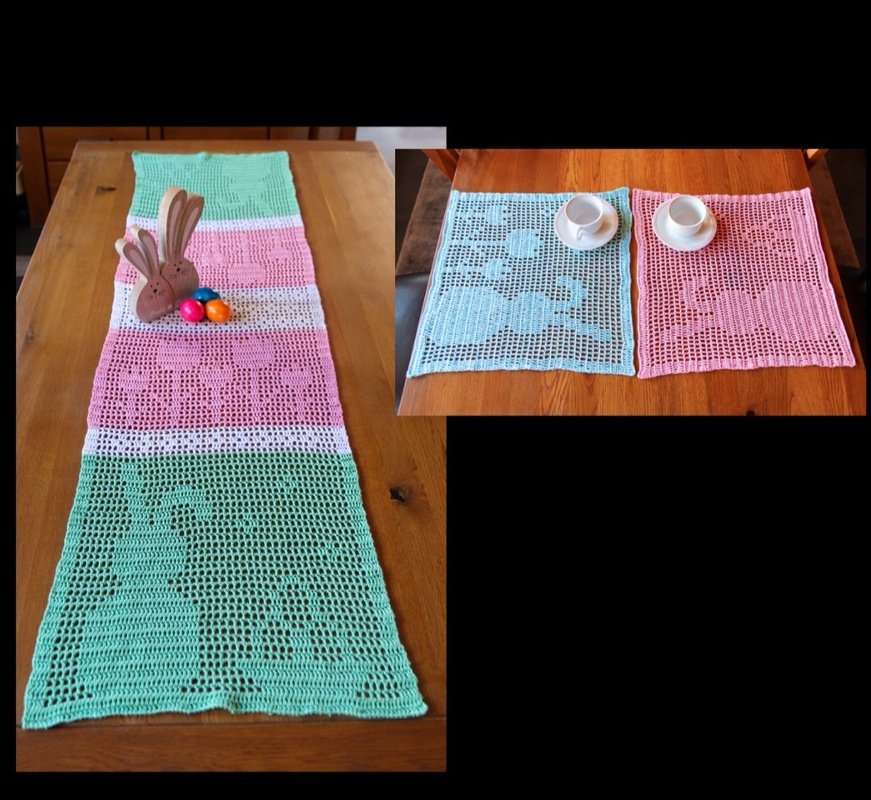 You like easter, rabbits, flowers and spring? So you can now crochet your own easter doily or table mat with two different motifs and the matching table runner.