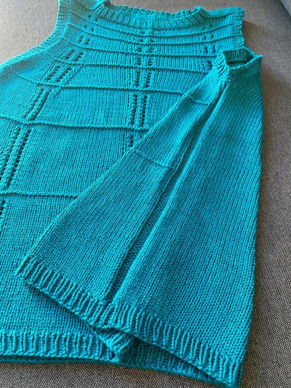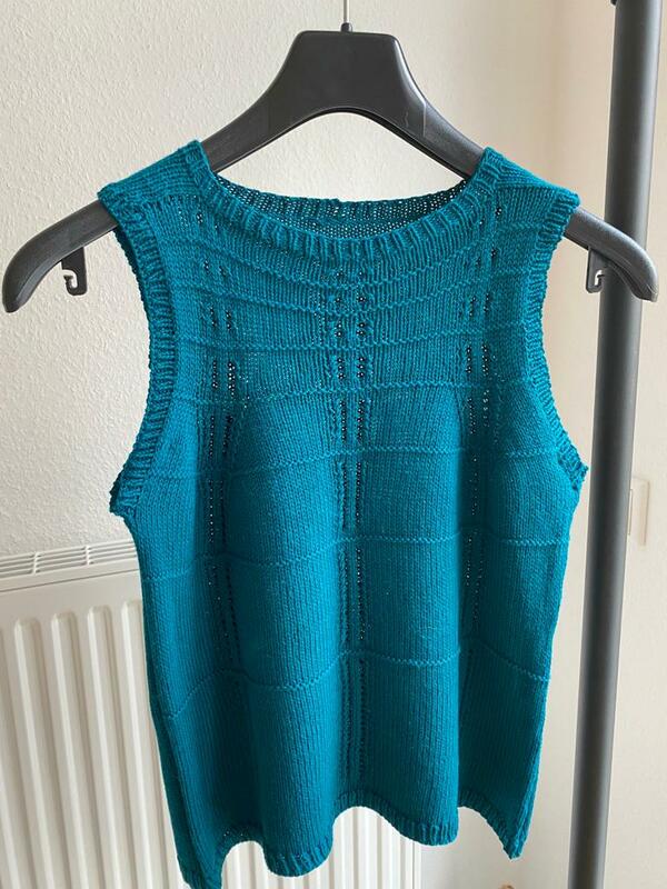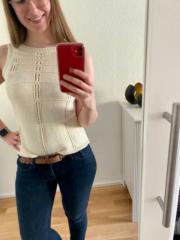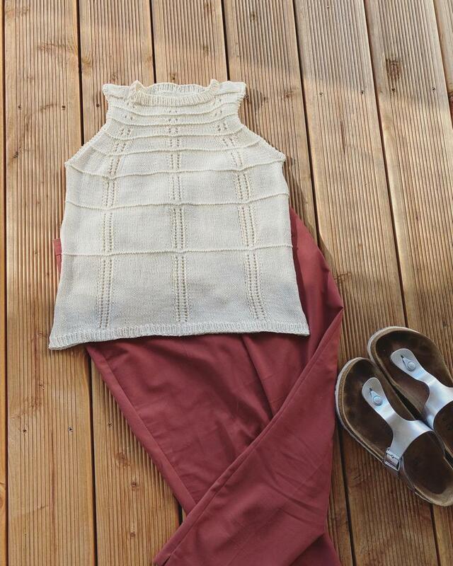 The Fibonacci top is knitted seamless from the top down. You start with the cuff for the neckband. After knitting the neckband you knit the shoulders seamless. Next you pick up stitches from the shoulders and the back panel of the top is knitted flat. The increases for the back panel are made in a decorative wide raglan line. The front panel is knitted in the same way, but the Fibonacci pattern is worked across the front panel. The discreet lace pattern is worked within both of the raglan lines and in the middle of the front panel of the top. After the increases the back and front panel are joined to knit in the round and the Fibonacci pattern continues across the front panel.