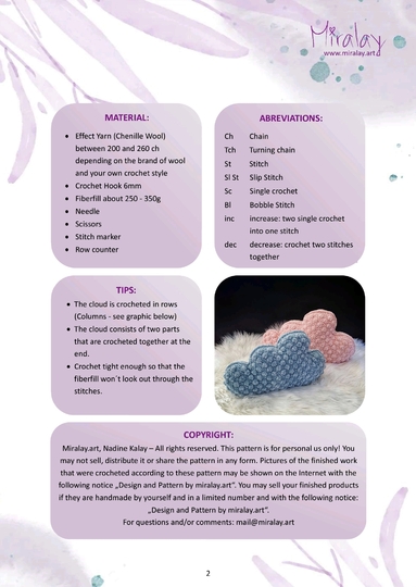 Miralay.art, Nadine Kalay – All rights reserved. This pattern is for personal us only! You may not sell, distribute it or share the pattern in any form. Pictures of the finished work that were crocheted according to these pattern may be shown on the Internet with the following notice „Design and Pattern by miralay.art“. You may sell your finished products if they are handmade by yourself and in a limited number and with the following notice: „Design and Pattern by miralay.art“.