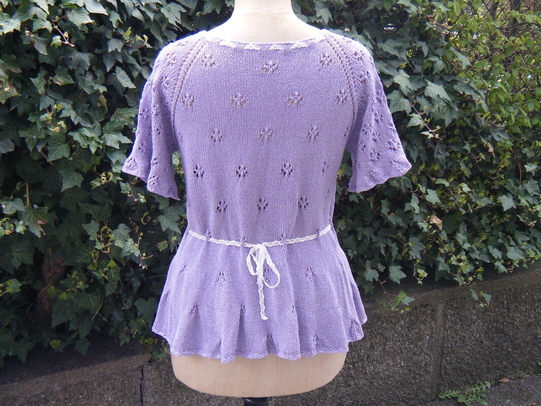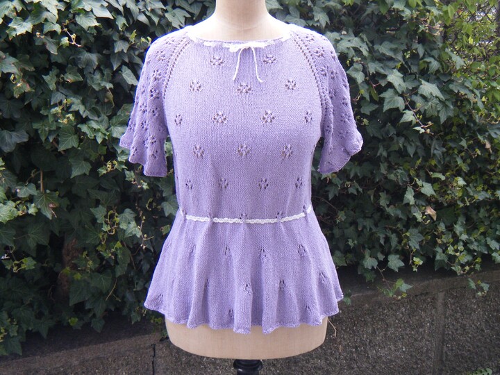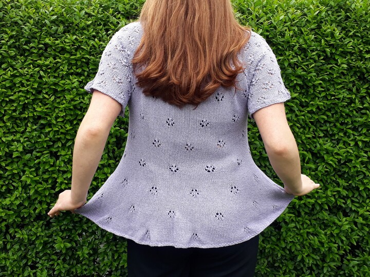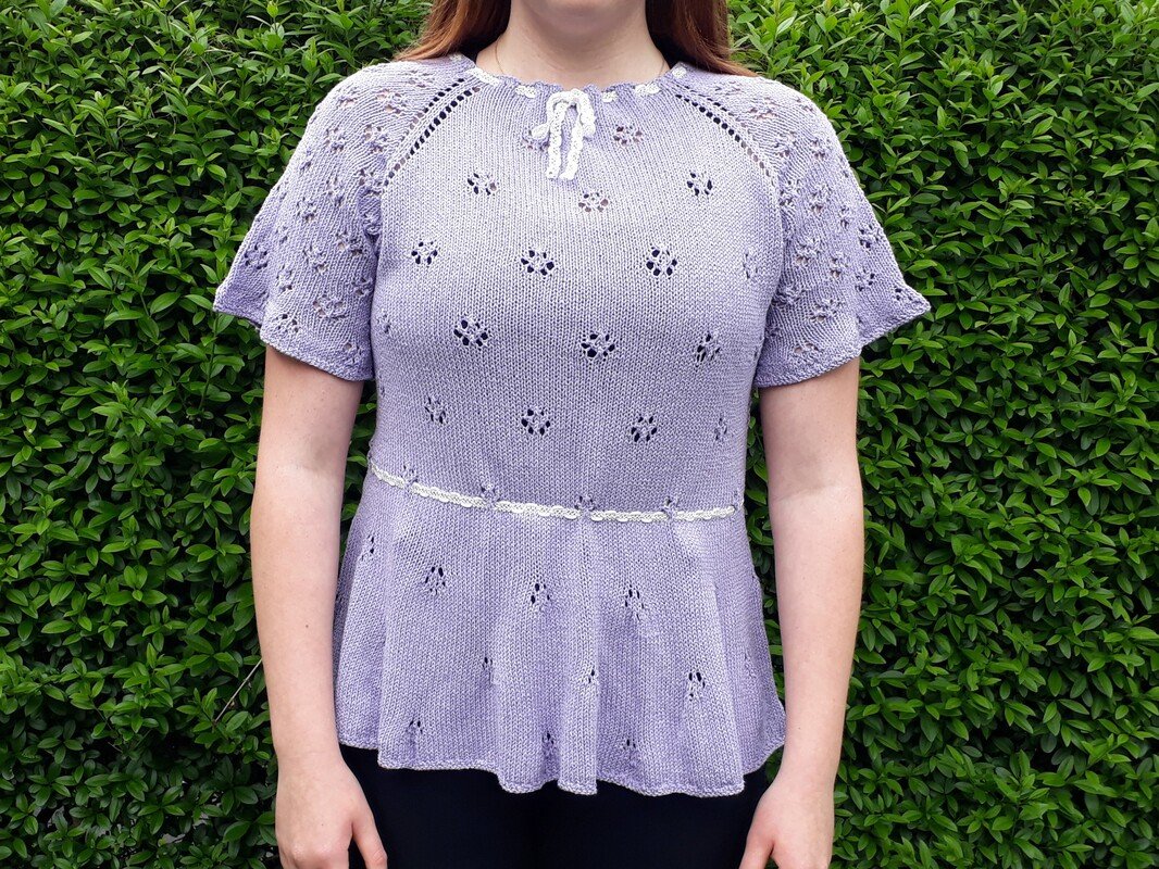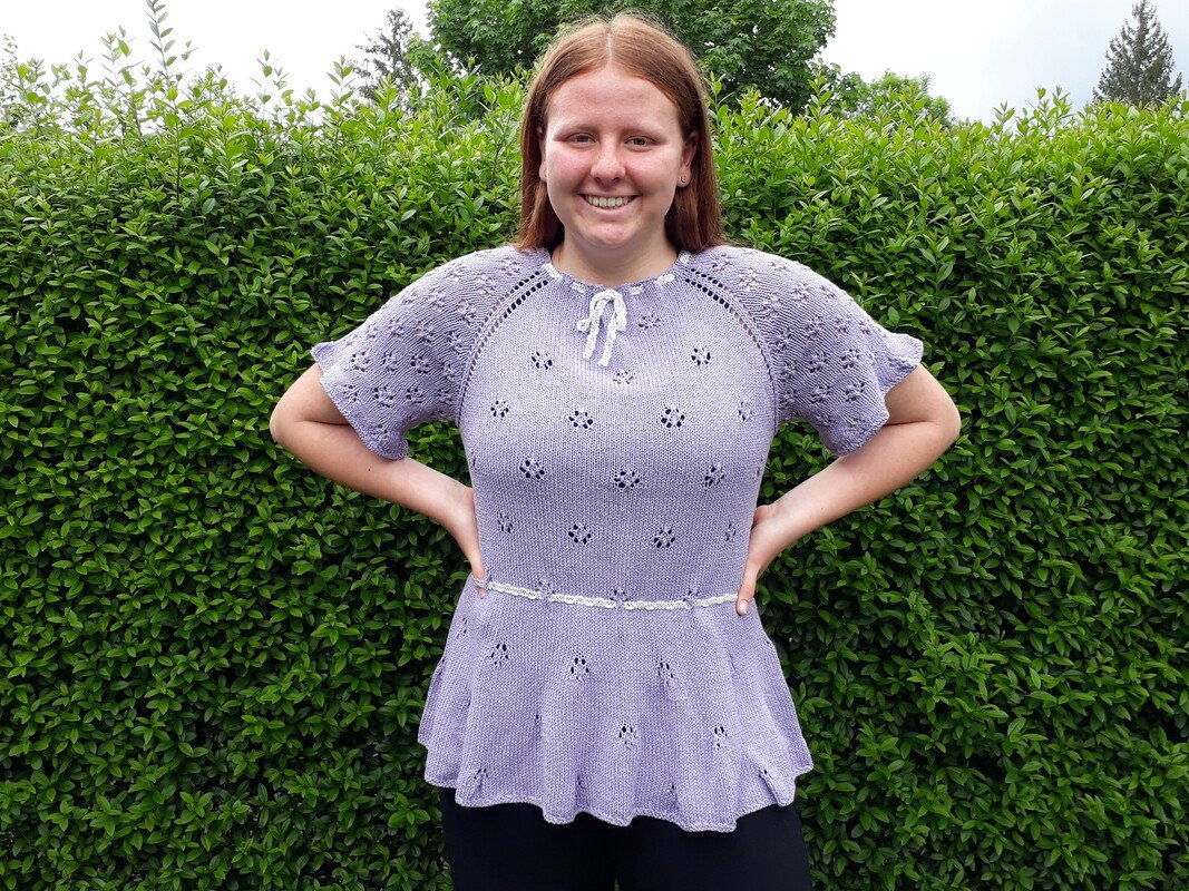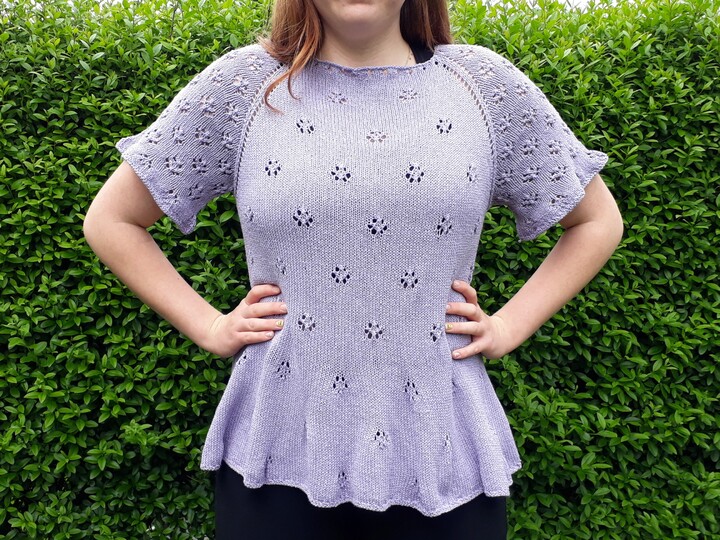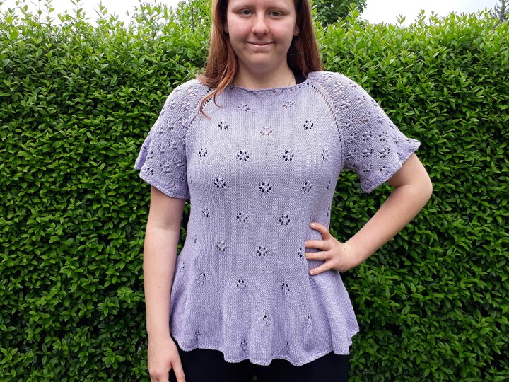 Many little flowers come together on this romantic summer jumper. The knitted peplum flatters the hips and a more or less strong figure accentuation can be regulated with the waist band itself. The sleeves are finished with a light ruffle, which is also knitted on.