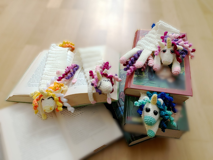 If you want to vary the bookmark a little, you have many options: you can crochet the arms and legs at the same time as the body, as well as the ears - this eliminates the need to sew them on at the end! And also for the eyes I described several possibilities - teddy eyes, embroidered eyes, etc... you can squiggle the horn a bit, or not! The decision is entirely up to you!