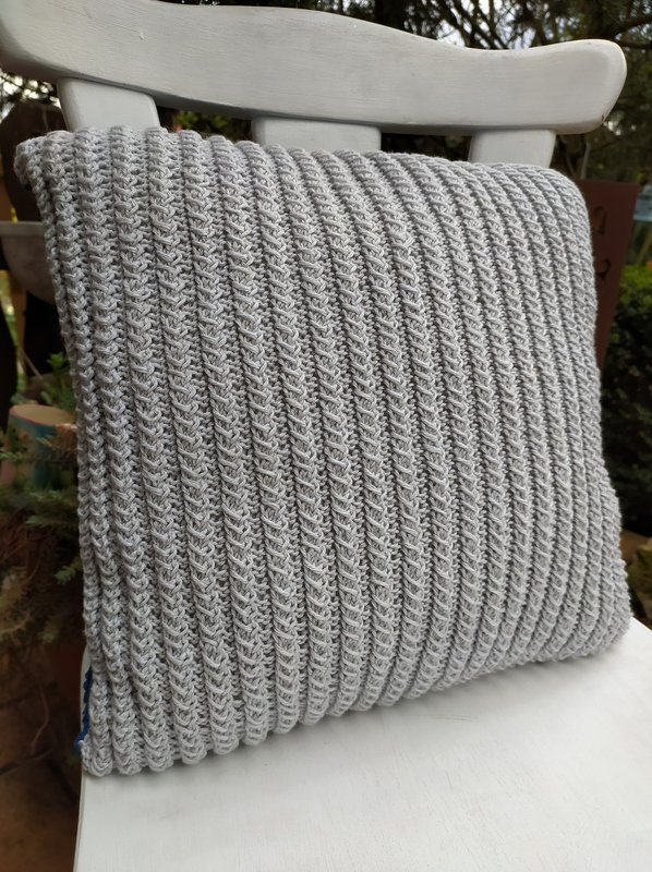 Für das zweifarbige Kissen habe ich 150 Gramm in Petrol und 150 Gramm in Silber des Garnes myboshi 50/50 verstrickt.