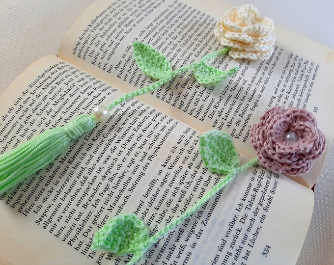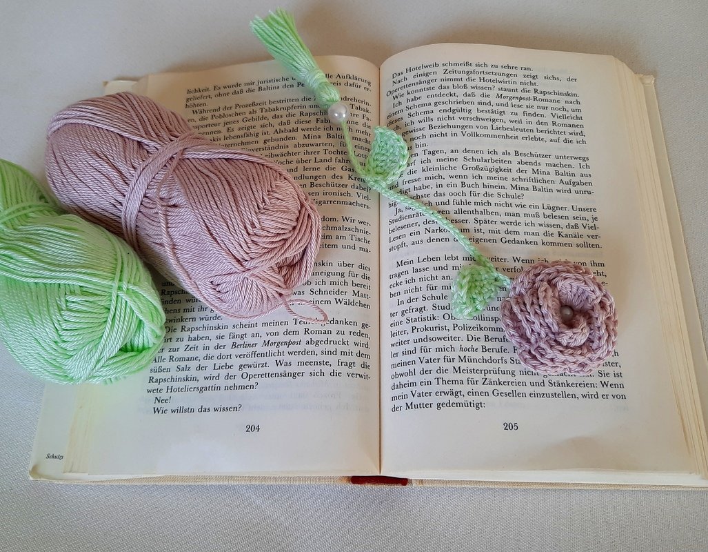 Das Lesezeichen besteht aus drei Teilen. Diese werden separat gehäkelt bzw. gefertigt.
