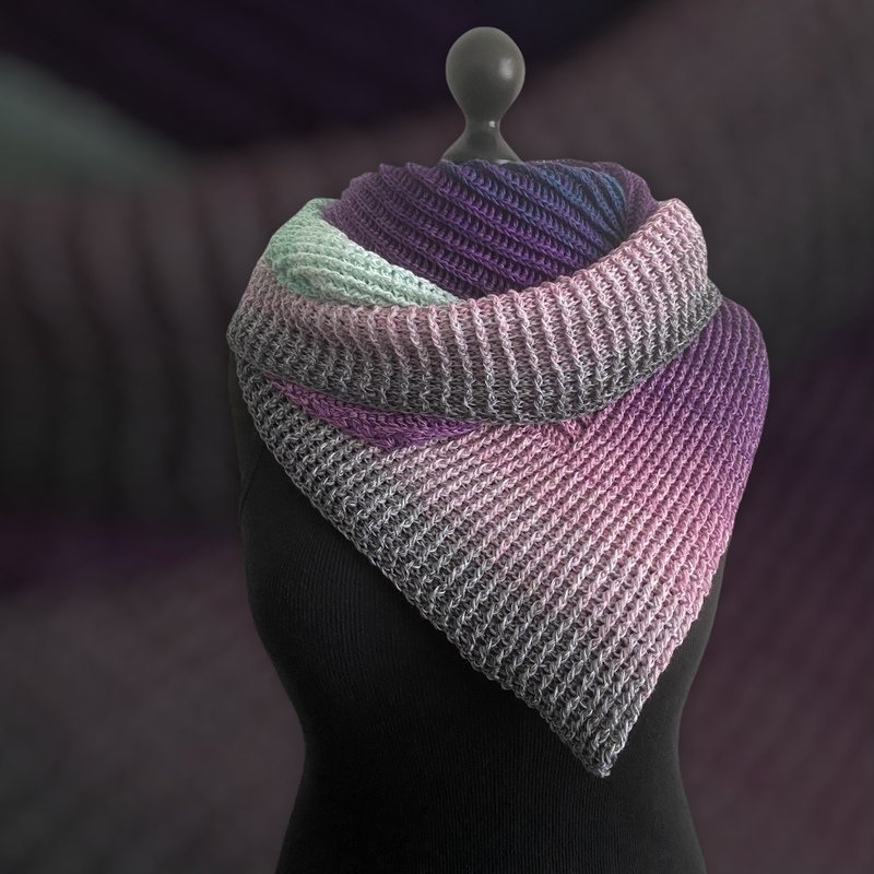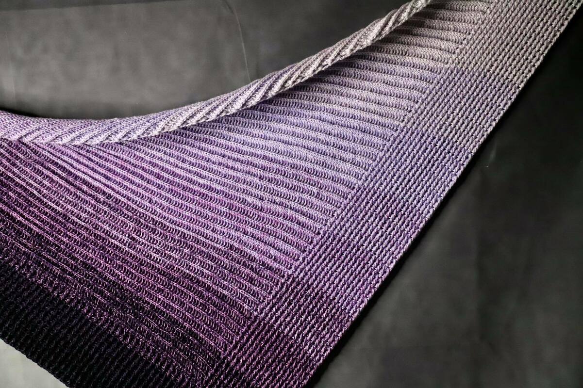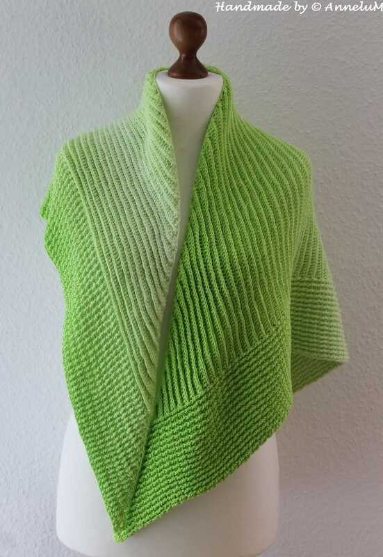 A little something for all the fans of back and front posted double crochtes. The shawl has an asymmetrical triangular shape and is crocheted in one piece from the side. The front and back post dcs running in different directions give the shawl an interesting pattern.