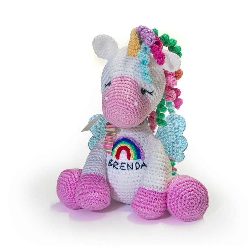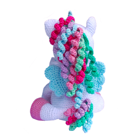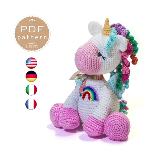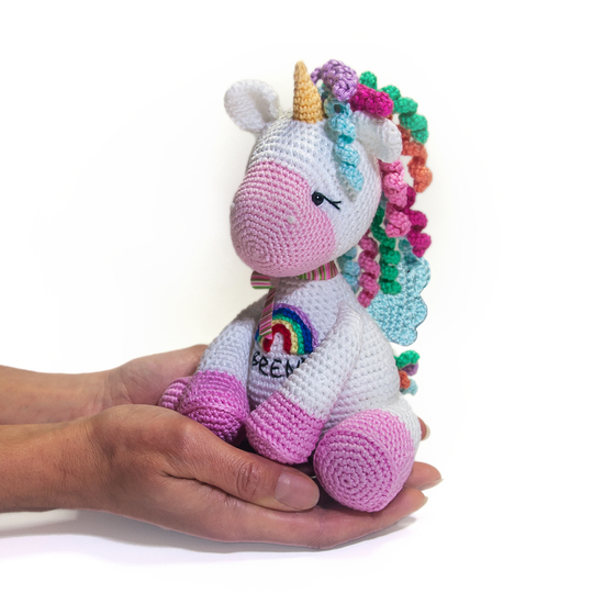 When using these materials, the size of the unicorn is 9 inch (23 centimeters). To make the toy smaller, use thinner yarn, to make the toy bigger, use thicker yarn.