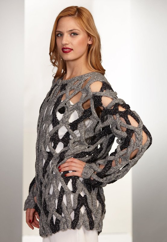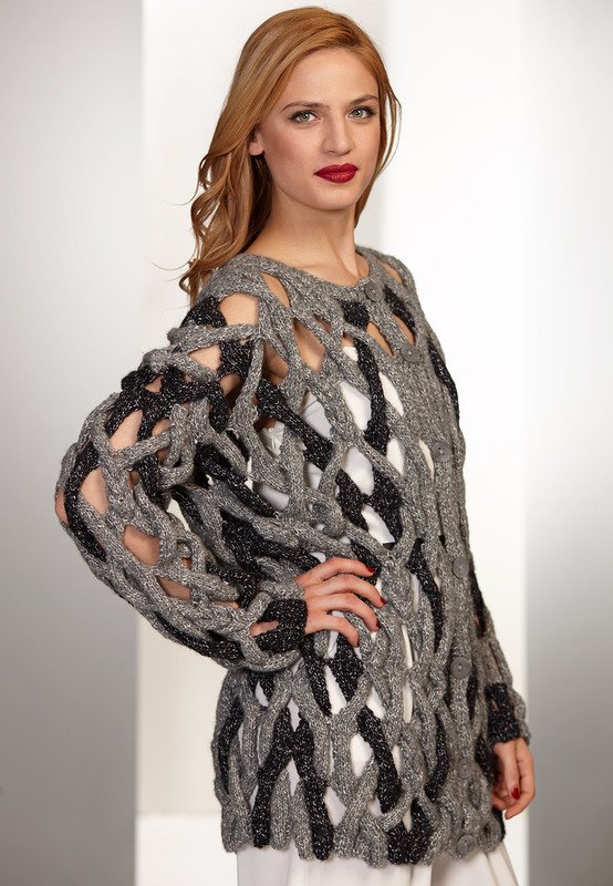 LANG YARNS „Alice“ (46% Baumwolle, 22% Polyamid, 18% Alpaka, 14% Wolle, LL ca 115 m/50 g): ca 550 g Grau Fb 0005 und ca 250 g Schwarz Fb 0004 Pony-Rundstricknd Nr 5, 80 cm lang 7 Knöpfe, 25 mm Ø, grau.