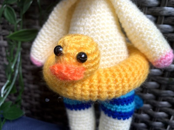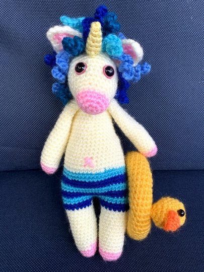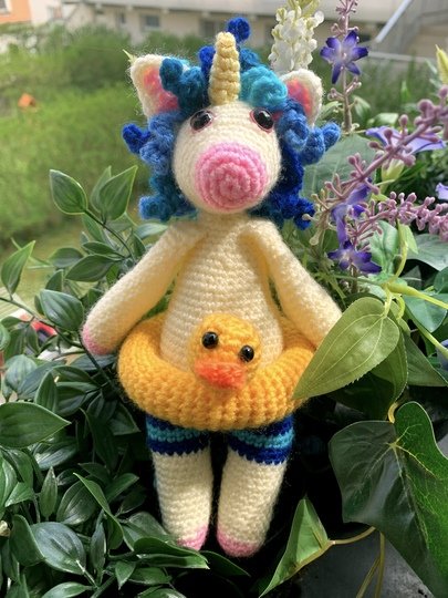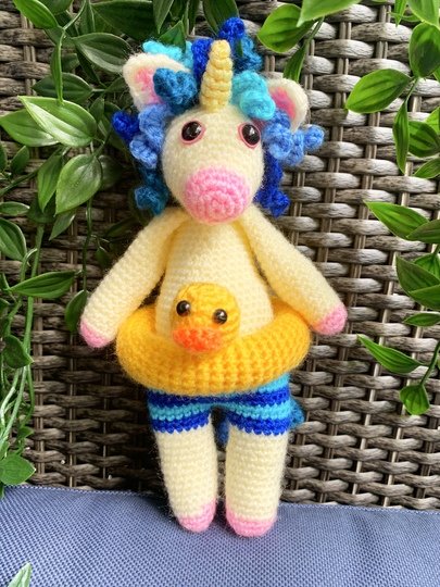 Pattern for a cute unicorn on the beach. The pattern includes the unicorn itself and the duck swimming hoop, is easy to understand and with lots of pictures.