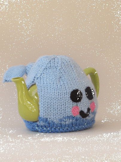 The blue whale tea cosy has oceans waves lapping at the bottom of the cosy. Ingeniously these waves are created by just knitting stripes, there's noting trickier involved.