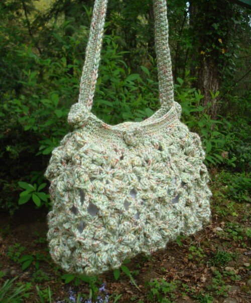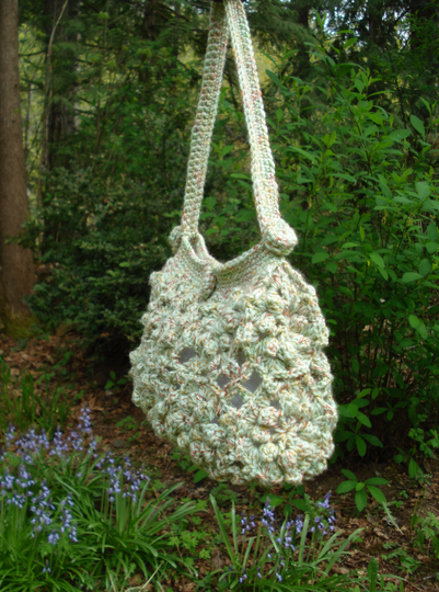 A trendsetting accessory that is created with nineteen popcorn stitch motifs that are joined as you crochet. Add a top trim, crocheted buttons and a shoulder strap and you have an eye-catching shoulder bag.