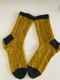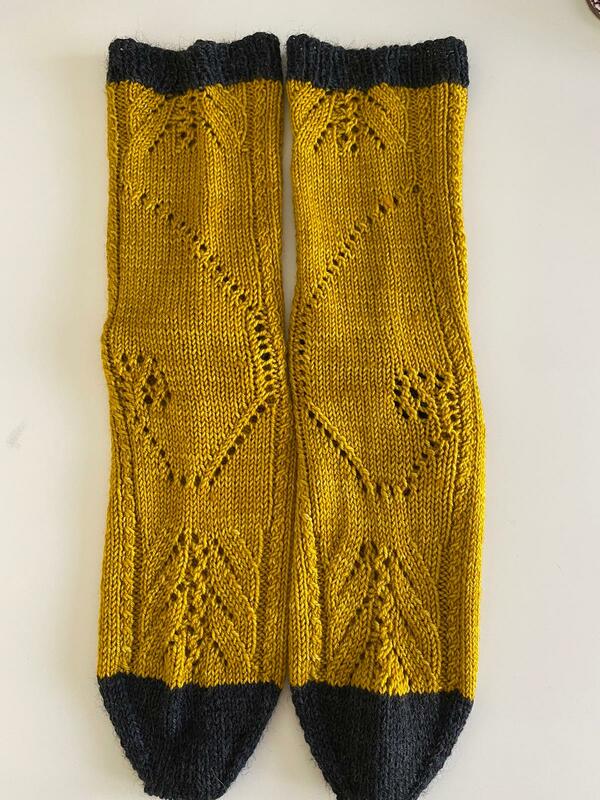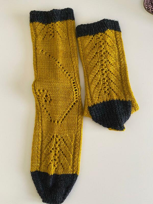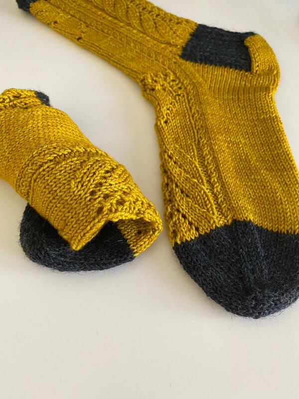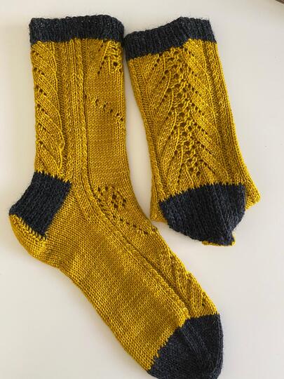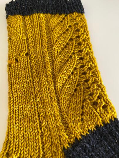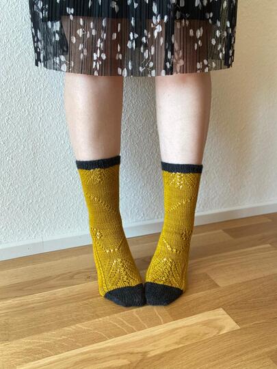 The Golden Spiral Socks are knitted cuff down. After the cuff you begin knitting the lace pattern of the socks. On the back of the sock the lace pattern is knit until the heel and on the front of the sock the lace pattern is knitted until the toes. The pattern contains the lace pattern as charts. Also there are detailed explanations for the heel and the toes.