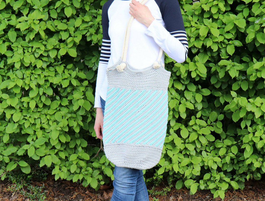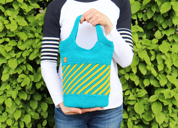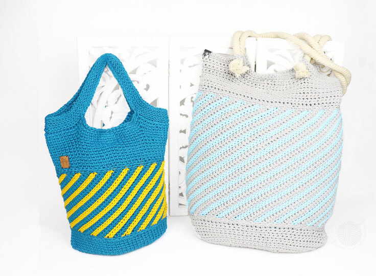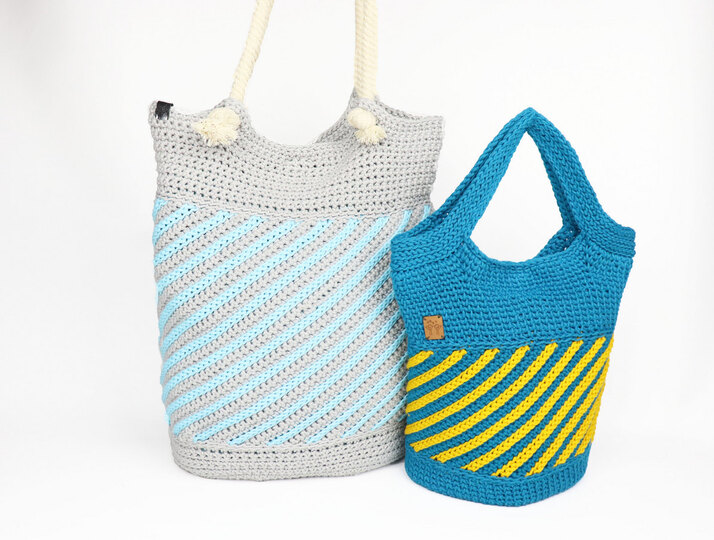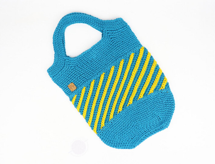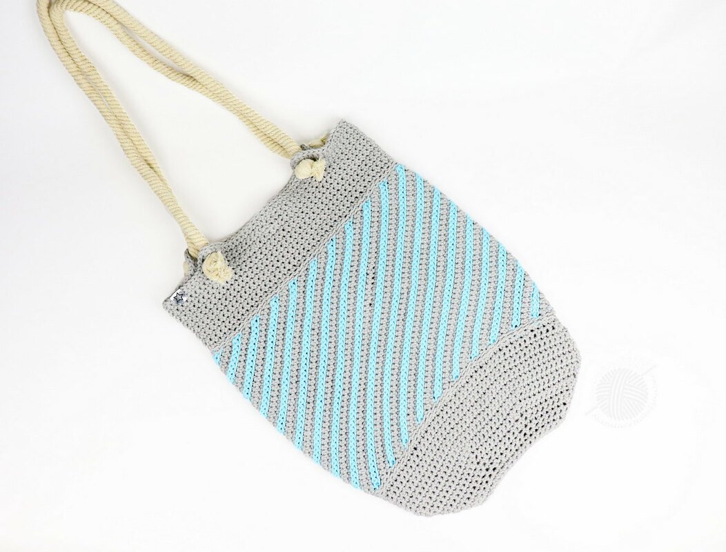 Yarn and Colors “Epic” 100 % Baumwolle, Lauflänge: ca. 75 m / 50 g, Alternative: Lana Grossa COTTON MIX 80 (McWool), 50 % Baumwolle, 50 % Acryl, Lauflänge: ca. 80 m / 50 g. Für kleine Tasche: 200 gr. von der Farbe Petrol (Farbnr. 070) und 50 gr. von der Farbe Geld (Farbnr. 015) und 50 gr. mehr von der Farbe Petrol für gehäkelte Henkel. Für große Tasche: 350 gr. von der Farbe Hellgrau (Farbnr.: 095) und 100 gr. von der Farbe Türkis (Farbnr. 074) und 50 gr. mehr von der Farbe Hellgrau für gehäkelte Henkel, Häkelnadel Nr. 5 und 5,5.