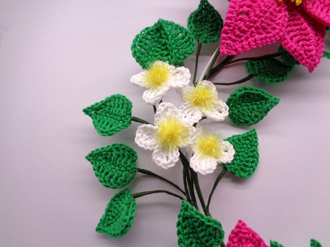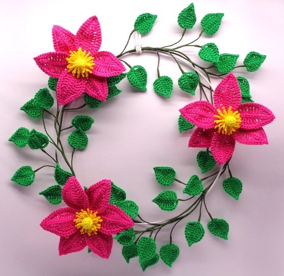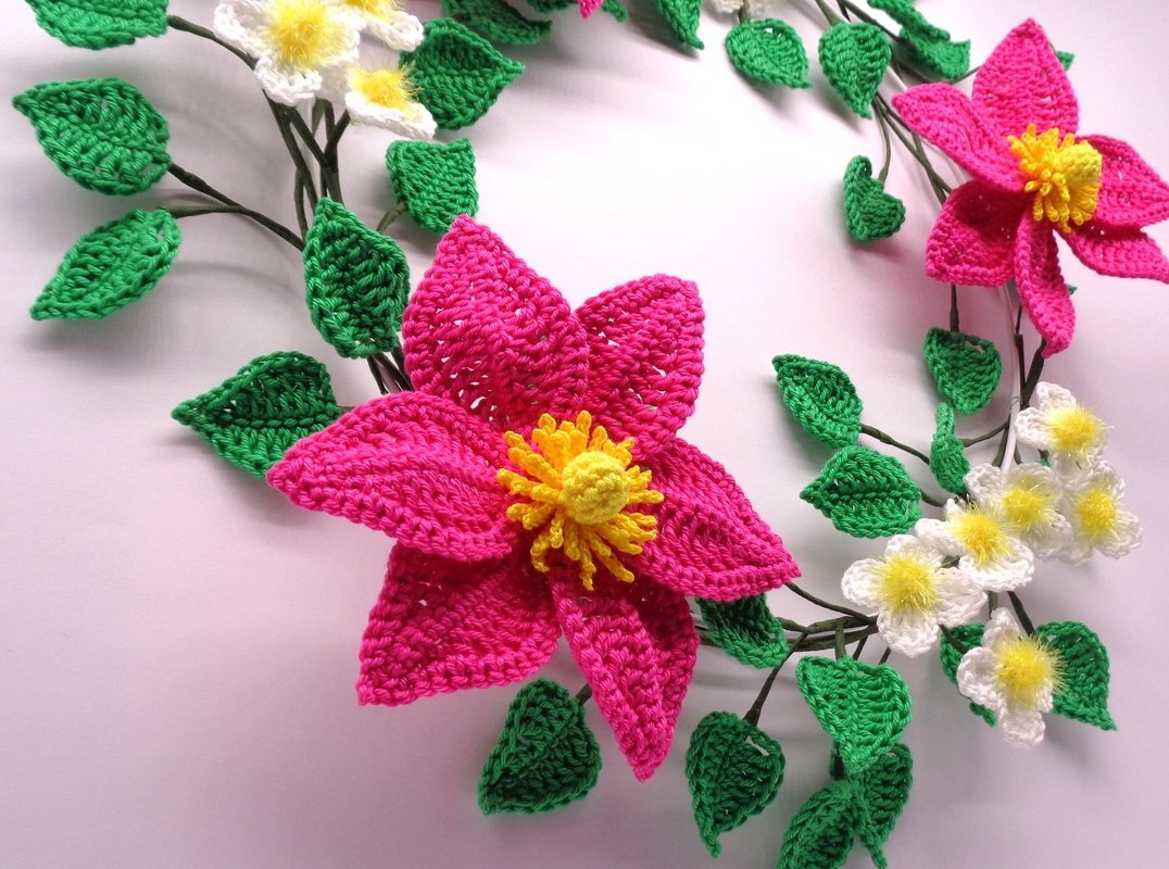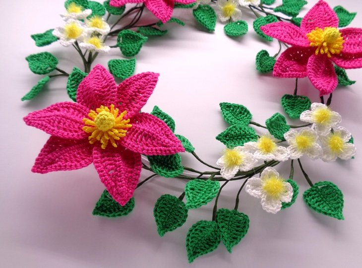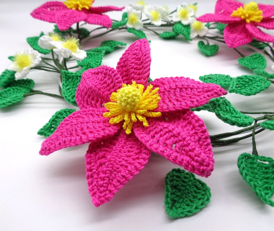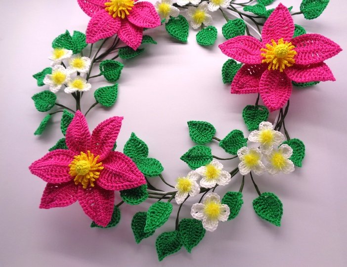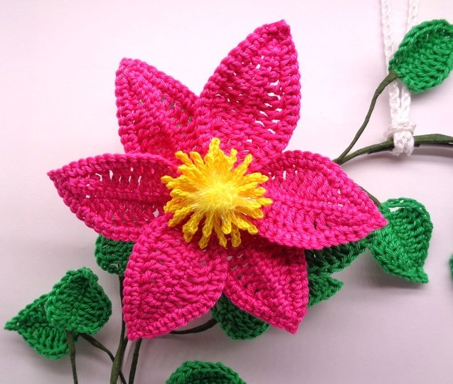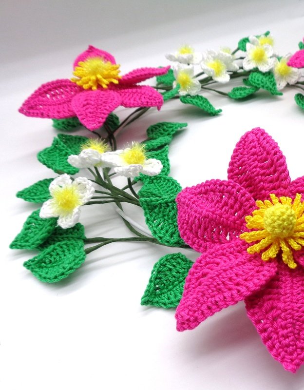 Die Anleitung umfasst zusätzlich zur schriftlichen Häkelerklärung auch die Häkelschriften für beide Clematisblüten und die Blätter, sowie sehr viele, detaillierte und ausführlich erklärte Schritt-für-Schritt Fotos, damit Du den Clematis-Blütenkranz ganz einfach erfolgreich nachmachen kannst.