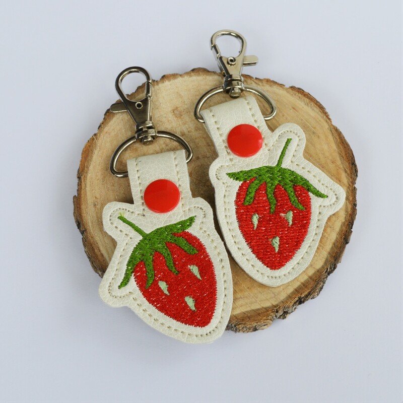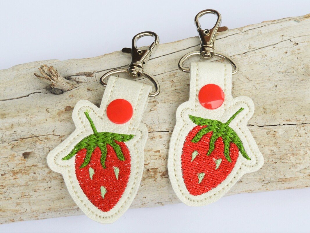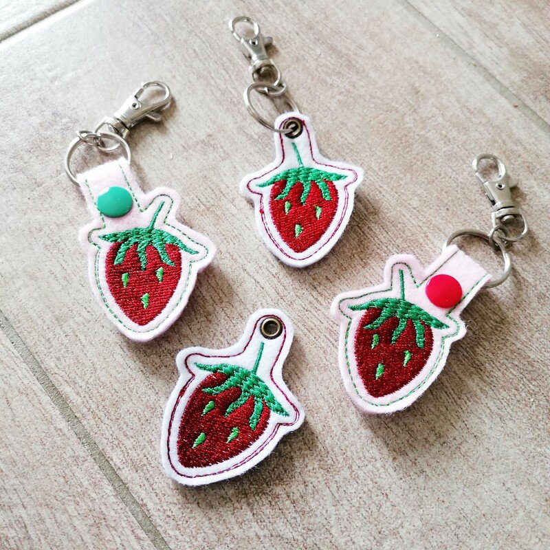 Stickdatei ITH Schlüsselanhänger Erdbeere und Anhänger Erdbeere mit Öse.