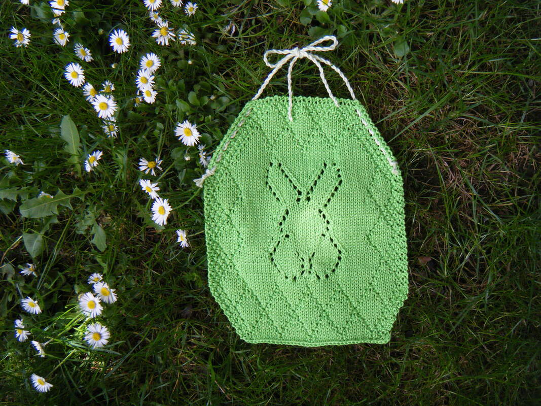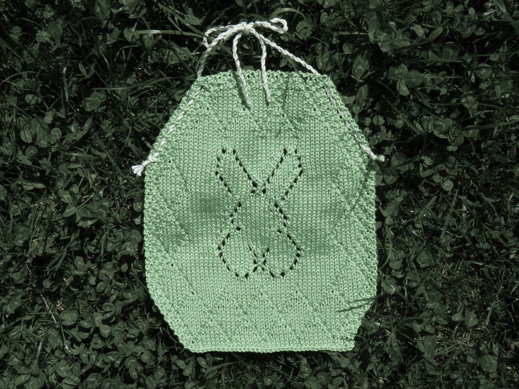 1 ball of cotton, 2 knitting needles and the bib is quickly knitted on a rainy weekend.