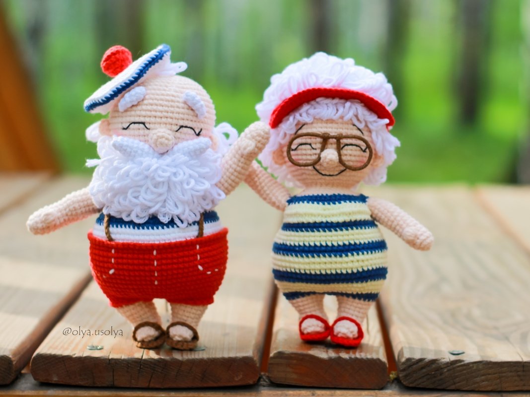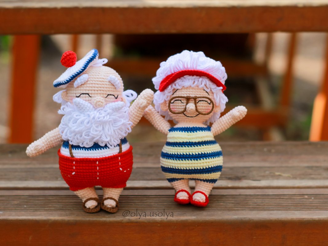 With this crochet patterns you can Crochet stuffed amigurumi toys "Grandpa and Granny Sailor" according to the original pattern by Olya Usolya.