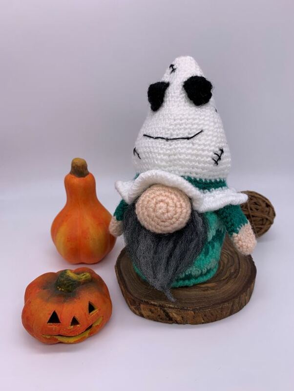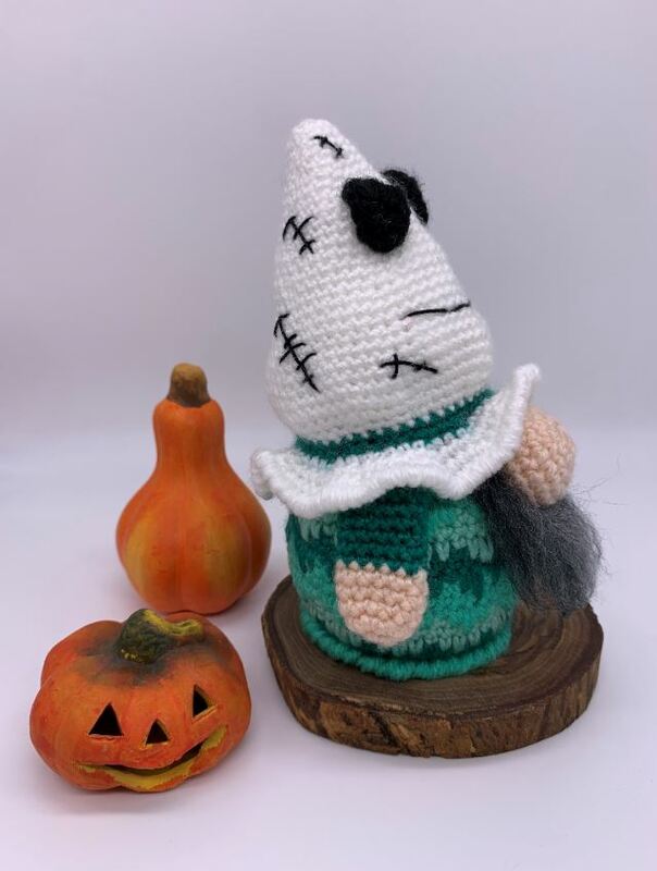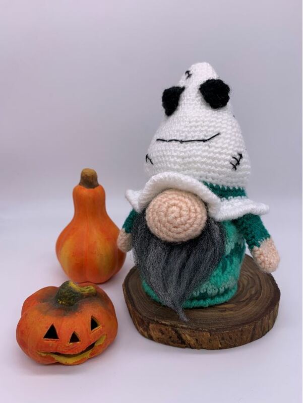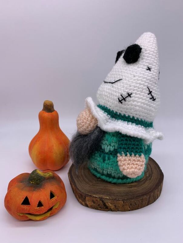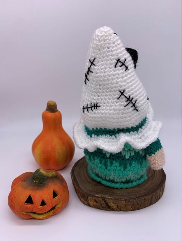 With this pattern you can crochet a creepy Halloween gnome. The body features a simple three-color pattern, the hat is a ghost head with lots of scars.
