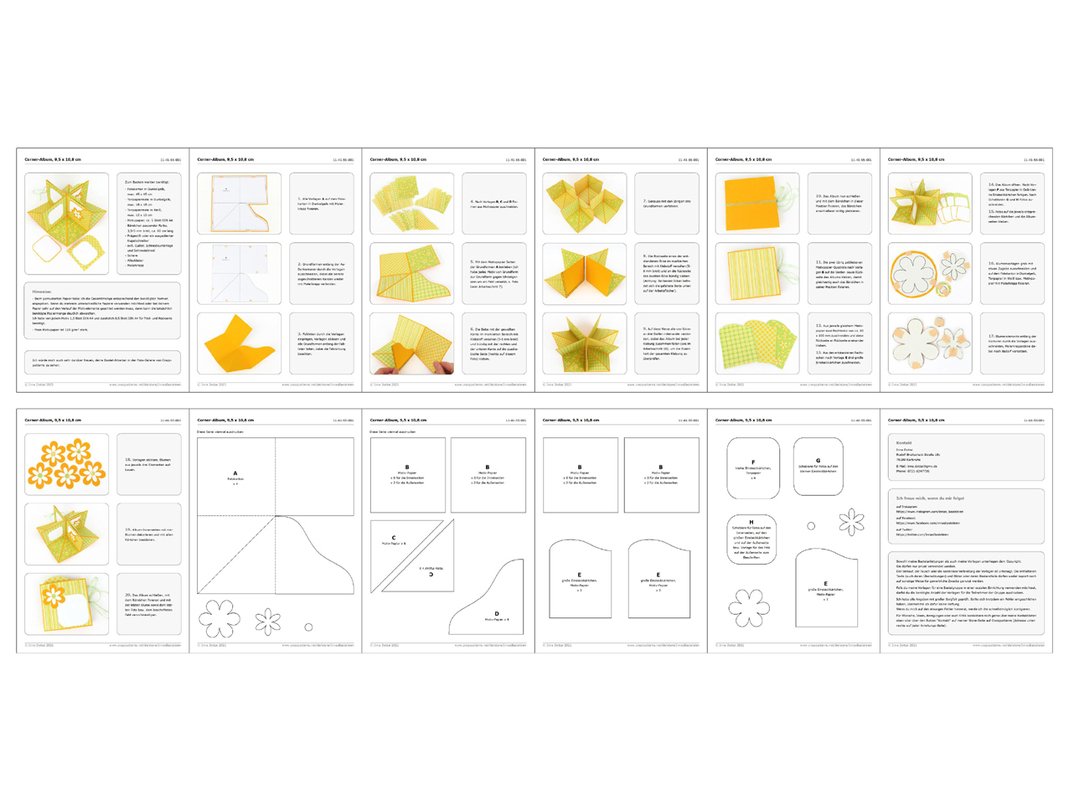 Um dieses Album zu basteln, sollst du mit Schere, Cutter und Schneidelineal umgehen können, wissen, wie man Faltlinien einprägt, Grundformen faltet und Schleifen bindet. Auch sollst du bereits mit Fotokarton und Klebstoff gearbeitet haben. Unter diesen Voraussetzungen wirst du dieses Album ohne Probleme nacharbeiten können.