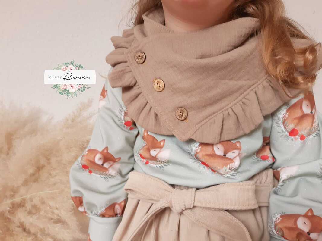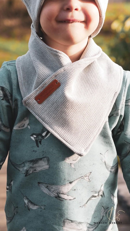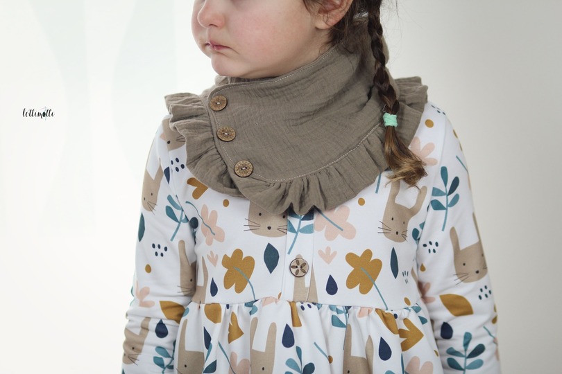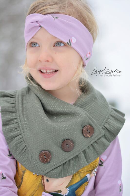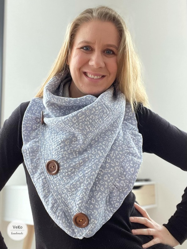 Der Schal wird mit Knöpfen verschlossen, kann aber bei dehnbaren Stoffen ohne diese zu öffnen direkt über den Kopf gezogen werden. Durch die zahlreichen Stoffarten die man dafür verwenden kann, eignet er sich auch perfekt von Herbst über Winter bis hin zum Frühling.