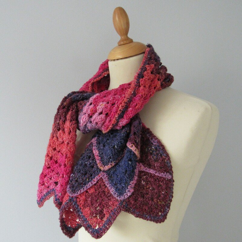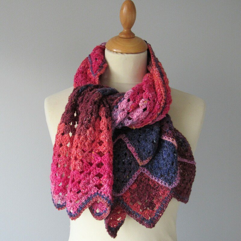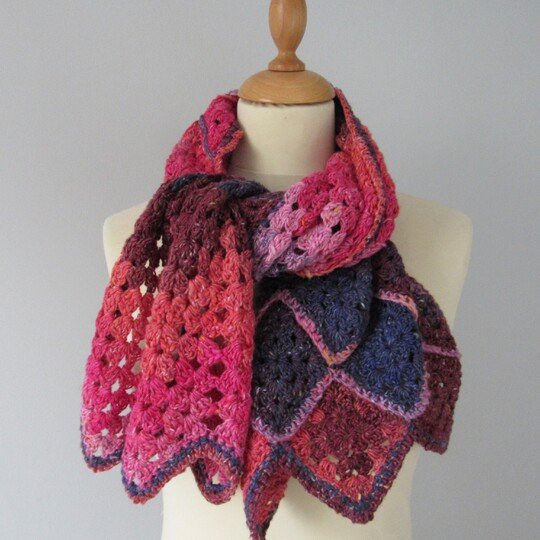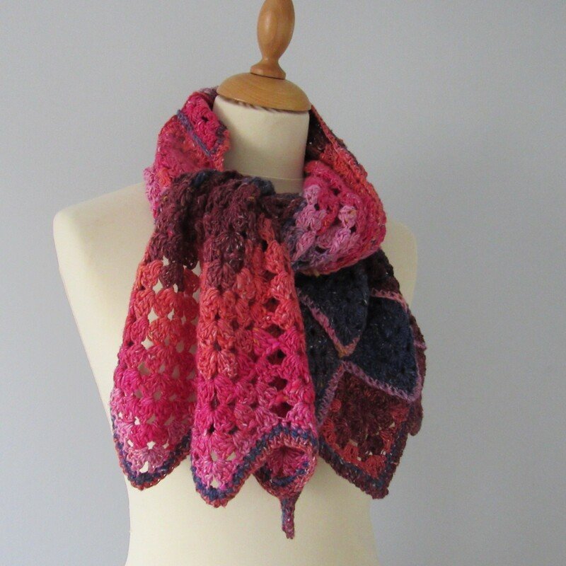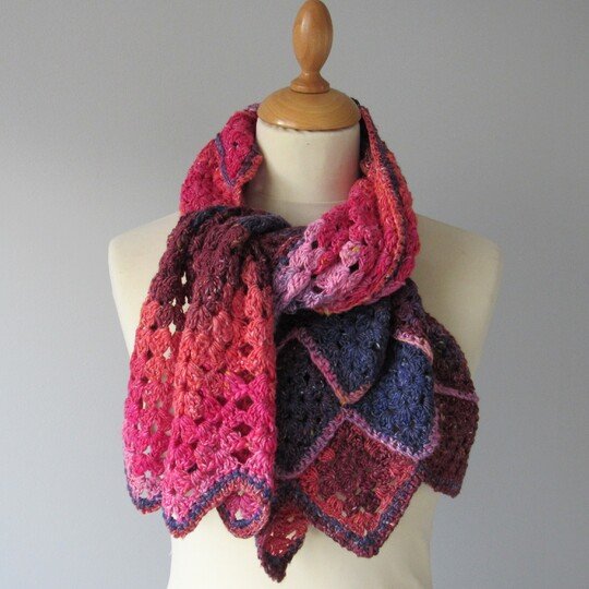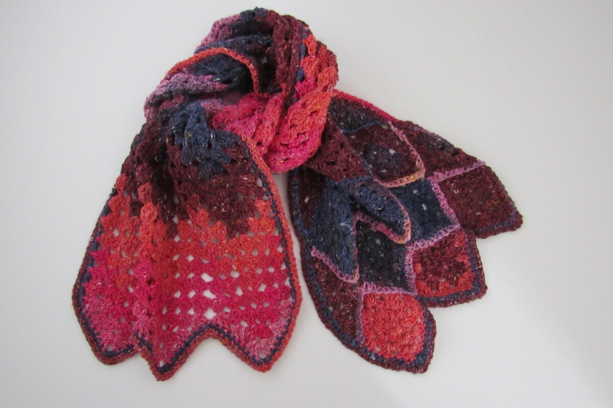 Working a ripple pattern for half the scarf and granny square and triangle motifs for the second half.