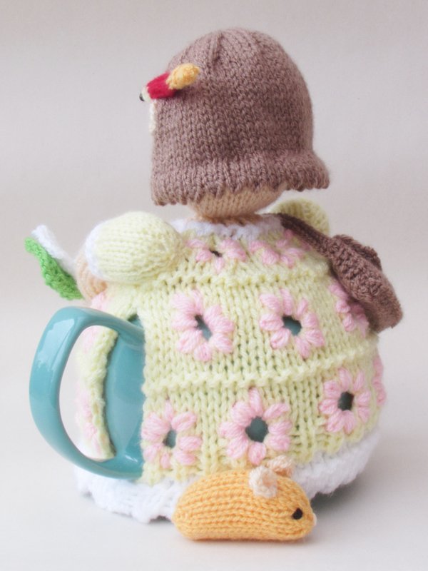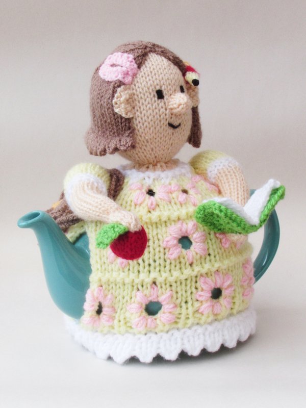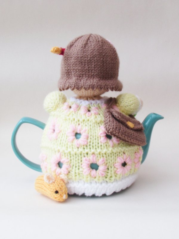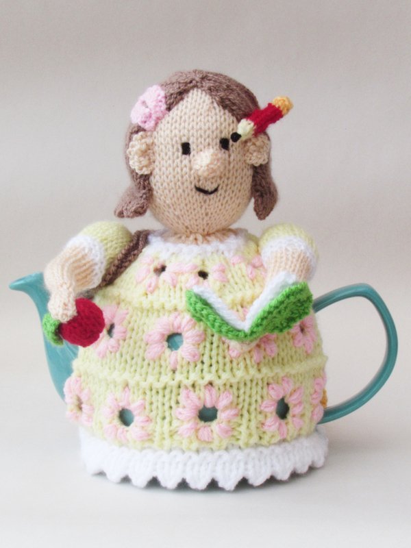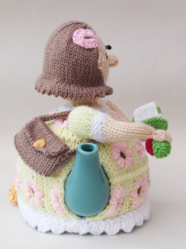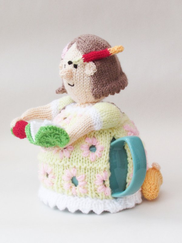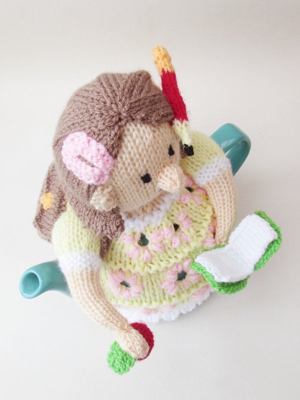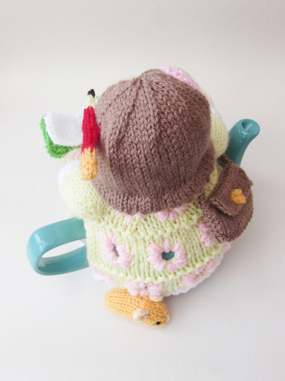 What I remember about my primary school teachers is that they wore pretty dresses and blouses, so the school teacher tea cosy is wearing a flowery dress. The centre of the flowers are actually holes to show off parts of the teapot beneath.
