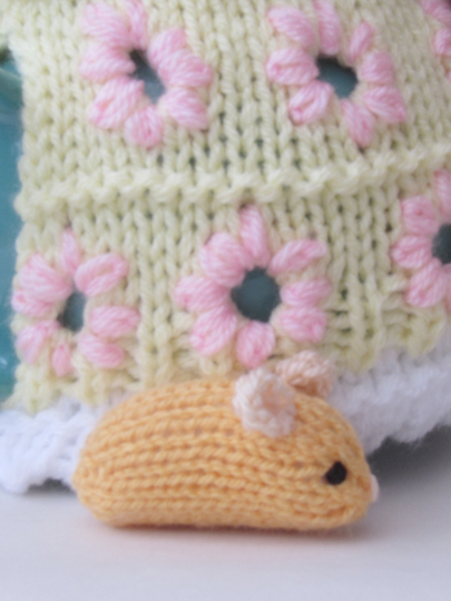 At the back of her I have knitted her a little hamster. I remember as a child we had a school pet in the class, and I thought this school teacher should have a little pet too. However, I think he must have escaped from his cage!
