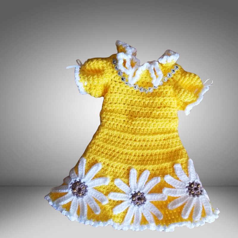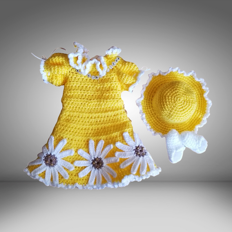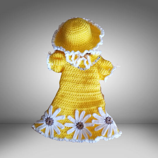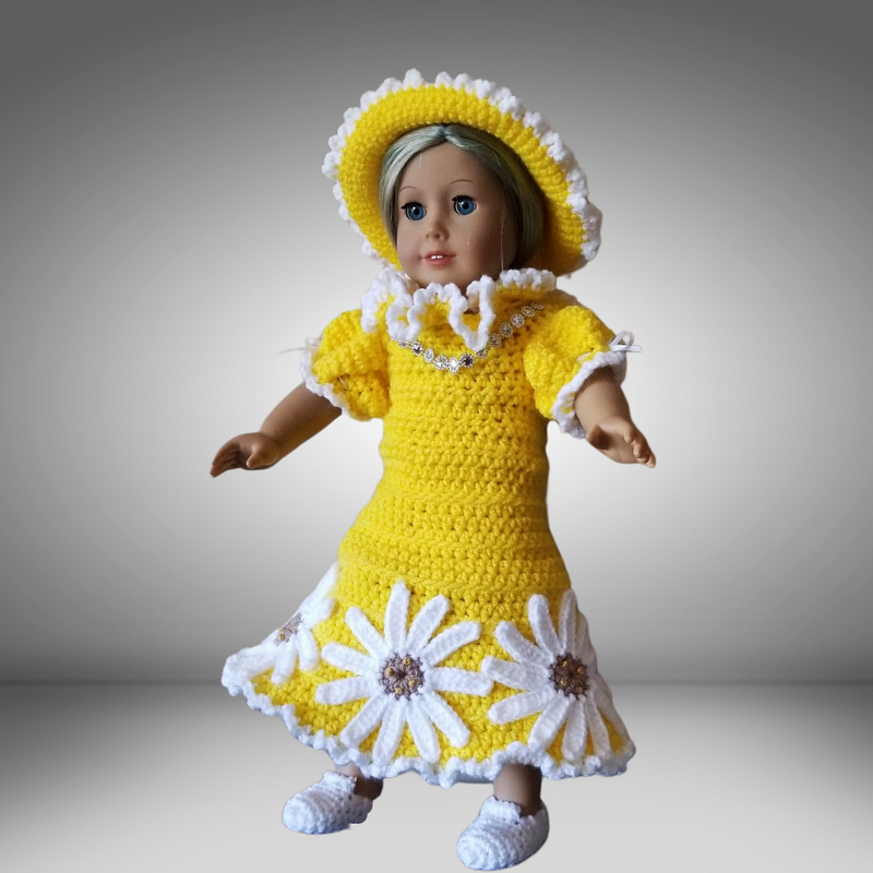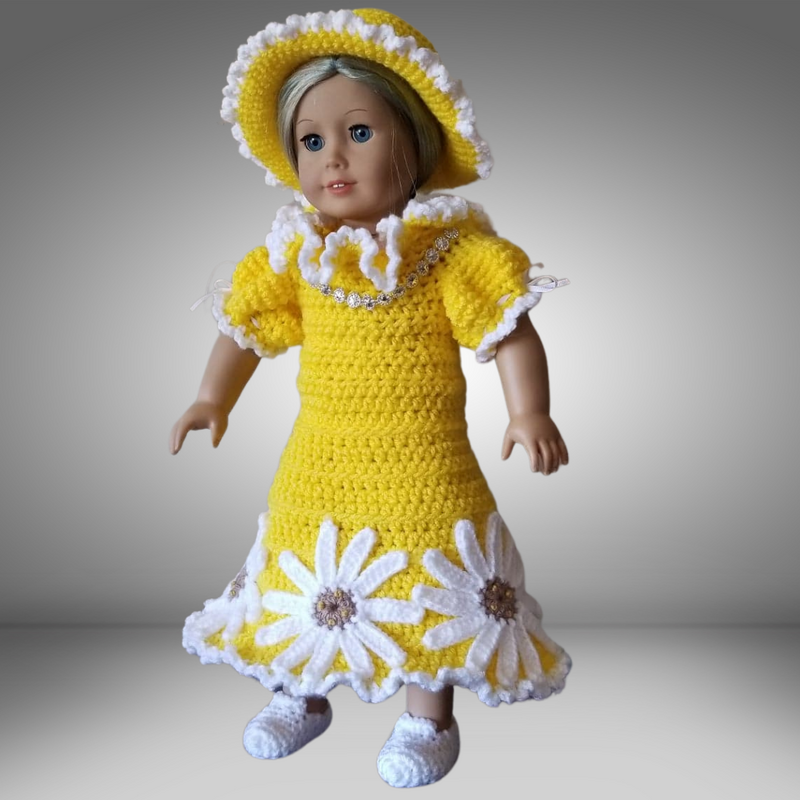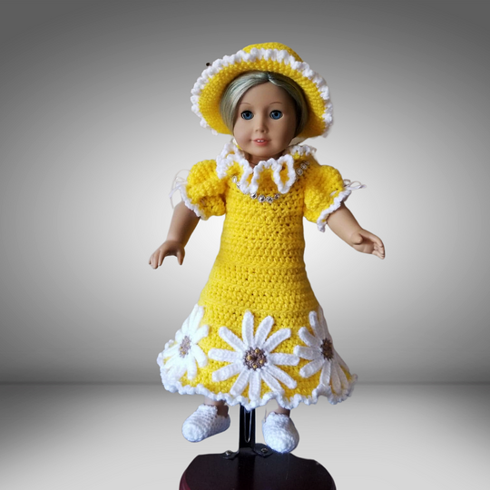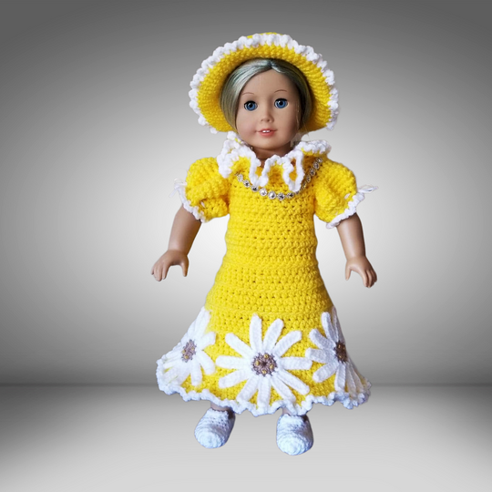 A beautiful sunny yellow 18” doll dress, hat and shoes.
