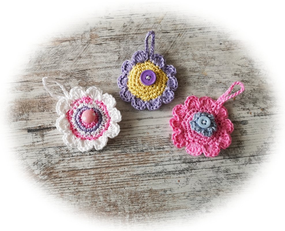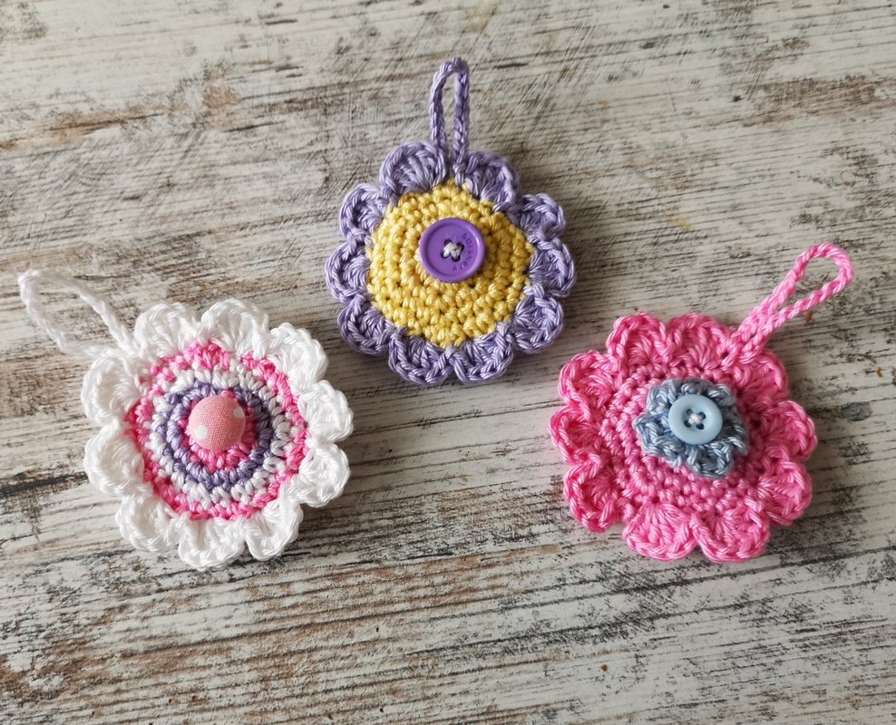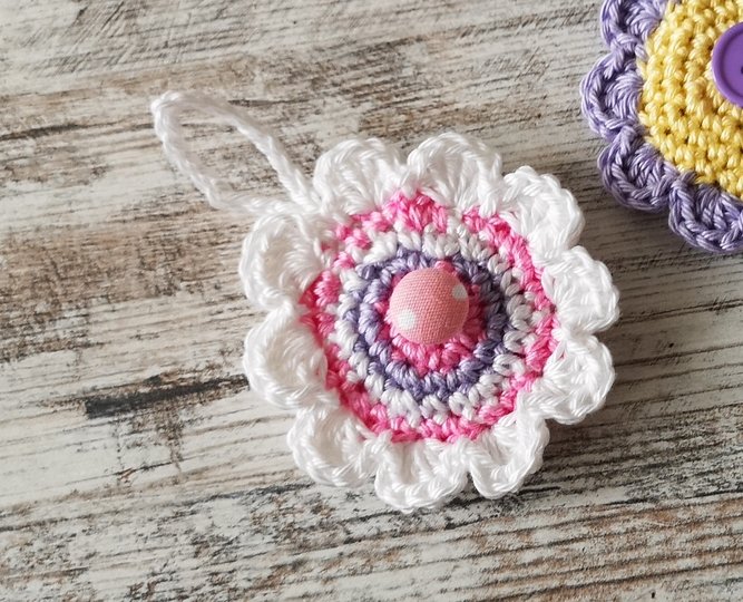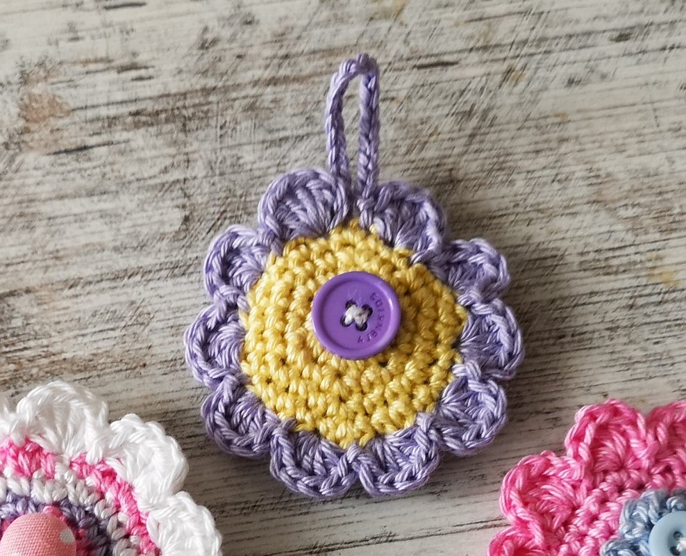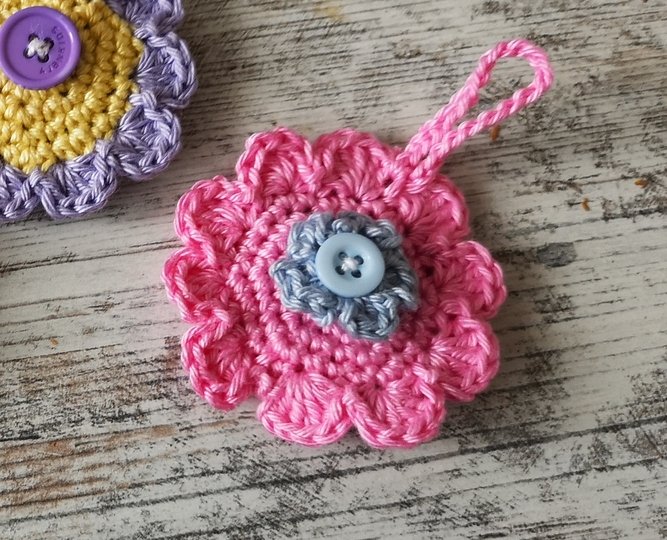 Bei Verwendung der genannten Materialien und Nadelgrößen hat das Blumentäschen einen Durchmesser von ca. 6 cm und ist passend für einen handelsüblichen Einkaufswagen-Chip (oder ein Geldstück).