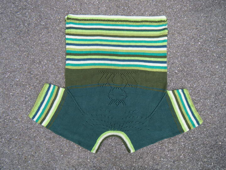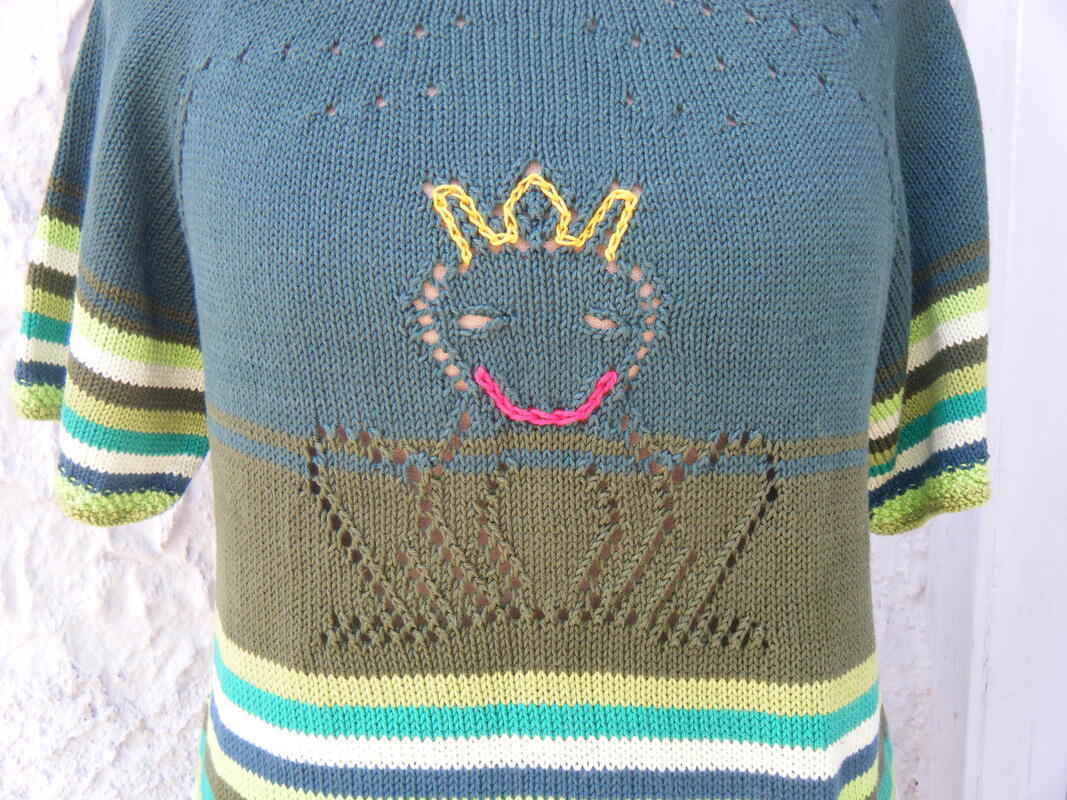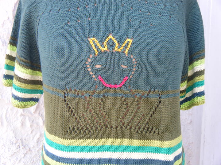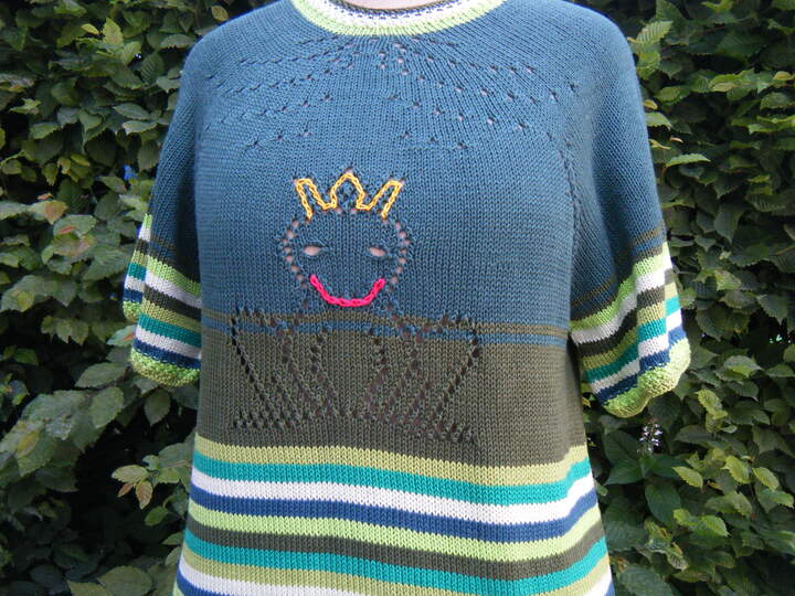 Knitted in rounds from top to bottom, this jumper is a fun scater-look garment that will get you talking in no time. The wearer can decide for himself whether the Frog Prince or the invitation to kiss is emblazoned on the front. The shirt can be worn any way you like.