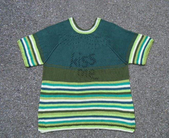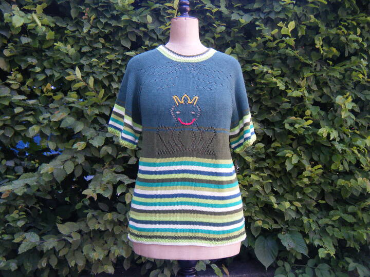 The shirt comes in a size that fits a chest circumference up to approx. 106cm. The length is approx. 70cm. If you follow the stitch gauge of 22M and 31R = 10cm.